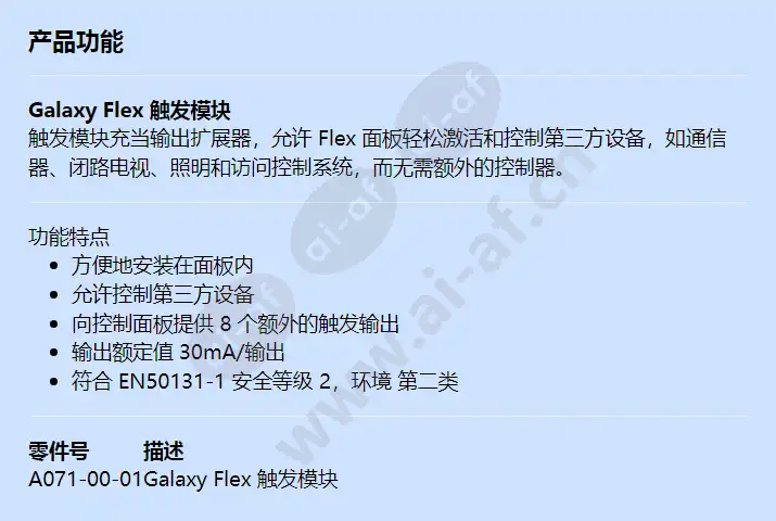 Galaxy Flex 触发模块 触发模块充当输出扩展器,允许 Flex 面板轻松激活和控制第三方设备,如通信器、闭路电视、照明和访问控制系统,而无需额外的控制器。 功能特点 方便地安装在面板内 允许控制第三方设备 向控制面板提供 8 个额外的触发输出 输出额定值 30mA/输出 符合 EN50131-1 安全等级 2,环境 第二类 零件号 描述 A071-00-01 Galaxy Flex 触发模块