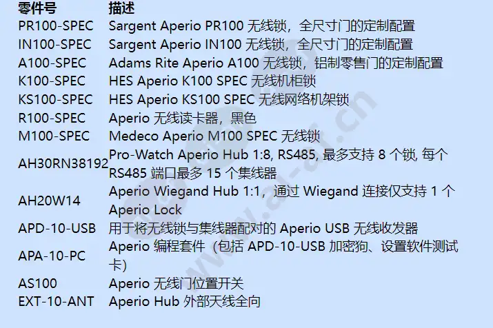 霍尼韦尔的 Pro-Watch 安全管理套件旨在应对当今苛刻环境的挑战,提供全面安全管理所需的灵活性、可扩展性和控制。 Pro-Watch 通过将访问控制、数字视频、入侵和其他功能组合到一个强大的系统中,为组织配备正确的工具来保护人员、保护资产并确保合规性。 与 Assa Abloy 的 Aperio 无线锁系列集成后,您可以将在线访问控制扩展到几乎每个开口。 Aperio 系列锁利用加密无线技术与 Pro-Watch 实时通信,允许用户管理和监控无线连接的门,类似于传统有线门。 Aperio 锁与 Aperio 集线器配对并无线通信,每个集线器最多支持 8 个锁定设备。锁和集线器之间的无线通信利用 128 位 AES 加密来确保安全。 Aperio 集线器通过 RS-485 直接连接到 PW6K1IC 集成控制器,允许每个控制器控制多达 64 个 Aperio 锁。 Aperio 锁具有多种不同的外形尺寸,可以针对许多不同的应用进行安装或改装。无论您是需要保护机柜、服务器机架、改装门栓还是安装全尺寸锁,Aperio 产品线都能提供满足您需求的解决方案。 所有外形规格均适用于 HID Prox 技术或 iClass,允许用户利用其现有凭证。 利用 900 MHz 无线协议与 Pro-Watch 进行实时通信以获得很好的无线范围 每个 PW6K1IC 控制器最多 64 个 Aperio 设备 每个 Aperio Hub 最多 8 个 Aperio 设备 每个 PW6K1IC 最多 15 个 Aperio 集线器 128位AES加密无线通讯 提供最高物理安全性的 ANSI/BHMA 1 级硬件 实时事件监控 支持 HID Prox 或 HID iClass 凭据 机柜锁、服务器机架锁、死锁改装或全门外形 提供各种定制手柄和饰面 商业级榫眼、圆柱形或出口门装饰的通道门锁 零件号