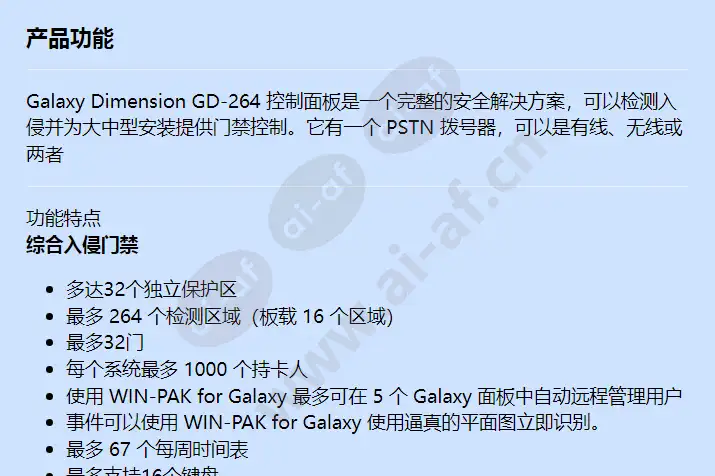 Galaxy Dimension GD-264 控制面板是一个完整的安全解决方案,可以检测入侵并为大中型安装提供门禁控制。它有一个 PSTN 拨号器,可以是有线、无线或两者 功能特点 综合入侵门禁 多达32个独立保护区 最多 264 个检测区域(板载 16 个区域) 最多32门 每个系统最多 1000 个持卡人 使用 WIN-PAK for Galaxy 最多可在 5 个 Galaxy 面板中自动远程管理用户 事件可以使用 WIN-PAK for Galaxy 使用逼真的平面图立即识别。 最多 67 个每周时间表 最多支持16个键盘 支持图形触摸屏键盘(2) 访问和入侵的事件日志(分别最多 1000 和 1500 个事件) 支持多种通信方式(GPRS PSTN、ISDN、以太网) 最多 32 个音频验证(监听)通道 基于单PC的中央管理解决方案 用于系统集成的增强型接口协议 EN50131-3:2009、EN50131-6:2008、PD6662:2010及第三方检测机构认证 完全兼容现有的 Galaxy 系列 零件号 描述 C264-D-E1 带 PSTN 拨号器的 Galaxy Dimension GD-264 控制面板 C264-D-E1-TCPR1 带 PSTN 拨号器和 TouchCenter Prox 的 Galaxy Dimension GD-264 控制面板 (CP042-00) C264-D-E1-TCKP1 带 PSTN 拨号器和 TouchCenter 的 Galaxy Dimension GD-264 控制面板 (CP041-00)
