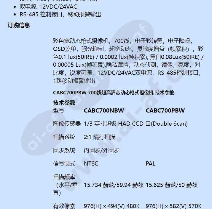 CABC700PBW 700线超高清宽动态枪式摄像机 产品特点和优势 性能特点与订购信息 市场优势 CABC700P(N)BW 宽动态枪式摄像机专业针对商业大楼, 连锁酒店,连锁商业机构,超市商场,教育系统,卫生医院,银行,住 宅,仓储等市场的客户对室内监控视频环境的需求,其外观设计大方, 内部结构紧凑,OSD 功能菜单操作简易,施工安装调试省时省力,是 您对安全防范和视频管理进行实时知情并作出高端决策的很好选择。 主要特性 1/3 英寸 Super HAD CCD Ⅱ(双扫描) 水平分辨率: 700 TV Lines 电子彩转黑,电子降噪,OSD 菜单,强光抑制, 超宽动态,灵敏 度增益(帧累积) 最低照度 : 彩色0.1 Lux(50IRE) / 0.0002 Lux(帧积累), 黑白 0.08Lux(50IRE) / 0.00005 Lux(帧积累) 隐私遮挡区域 15 个, 动态侦测区域4 个 镜像,亮度,对比度,锐度可调 双电源: 12VDC/24VAC RS-485 控制接口,移动报警输出 订购信息 CABC700NBW ( N 制) CABC700PBW ( P 制) 彩色宽动态枪式摄像机, 700 线,电子彩转黑,电子降噪, OSD 菜单,强光抑制,超宽动态,灵敏度增益(帧累积), 彩色 0.1 lux(50IRE) / 0.0002 lux( 帧积累 ) , 黑白 0.08Lux(50IRE) / 0.00005 Lux( 帧积累 ) , 隐私遮挡,动态侦测,镜像,亮度,对比度,锐度可调, 12VDC/24VAC 双电源, RS-485 控制接口, 1 路移动报警输出 CABC700PBW 700线超高清宽动态枪式摄像机 技术参数 技术参数 型号 CABC700NBW CABC700PBW 图像传感器 1/3 英寸超级 HAD CCD Ⅱ (Double