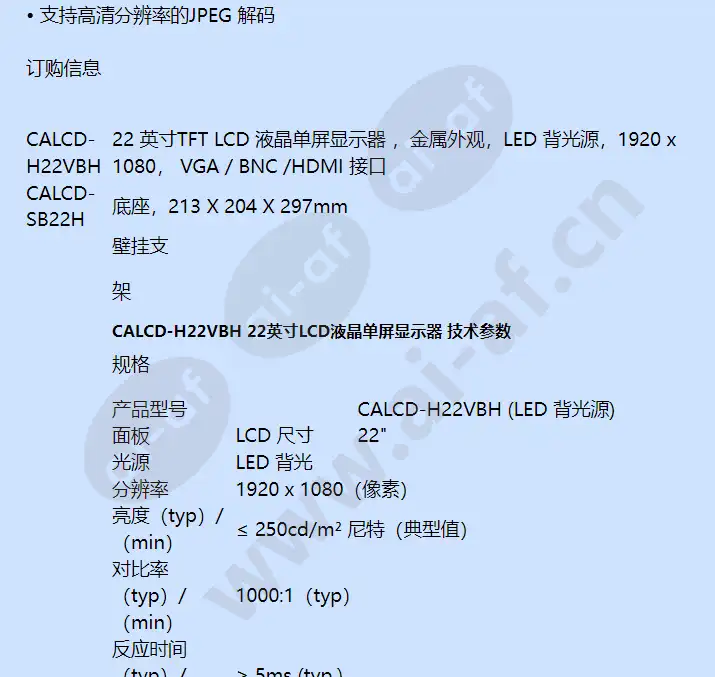 霍尼韦尔Honeywell CALCD-H22VBH 22英寸LCD液晶单屏显示器 产品特点和优势 性能特点与订购信息 • 22 英寸16:9 液晶单屏显示器 • LED 背光源 • 支持8bit/10bit 双路LVDS(1920 x 1080) 高清显示 • A 级专业显示器液晶面板,特殊薄层进行防热管理,可承受大幅度温度变化 • 最高亮度250cd / m2 • 最高对比度1000:1 • 采用3-D 数字梳状滤波器及3-D 降噪技术,有效消除图像干扰,还原高清锐利画质 • 响应时间快,有效抑制高速画面液晶拖尾、残影现象 • 可支持音频输出,喇叭配置2W+2W • 真彩色OSD,人性化操作菜单 • 专业监视标准接口,支持VGA 输入、HDMI 输入,支持一路BNC 监控视频输入和一路视频输出 • 支持软件展频技术,可降低EMI 干扰 • 支持高清分辨率的JPEG 解码 订购信息 CALCD-H22VBH 22 英寸TFT LCD 液晶单屏显示器 ,金属外观,LED 背光源,1920 x 1080, VGA / BNC /HDMI 接口 CALCD-SB22H 底座,213 X 204 X 297mm CALCD-WB22 壁挂支 架 CALCD-H22VBH 22英寸LCD液晶单屏显示器 技术参数 规格 产品型号 CALCD-H22VBH (LED 背光源) 面板 LCD 尺寸 22" 光源 LED 背光 分辨率 1920 x 1080(像素) 亮度(typ)/ (min) ≤ 250cd/m² 尼特(典型值) 对比率 (typ)/ (min) 1000:1(typ) 反应时间(typ)/ (min) ≥ 5ms (typ.) 像素点距 0.248(高)毫米 x 0.248(垂直)毫米 帧频 60 赫兹 视角 170 度 (H) / 160 度 (V) 寿命