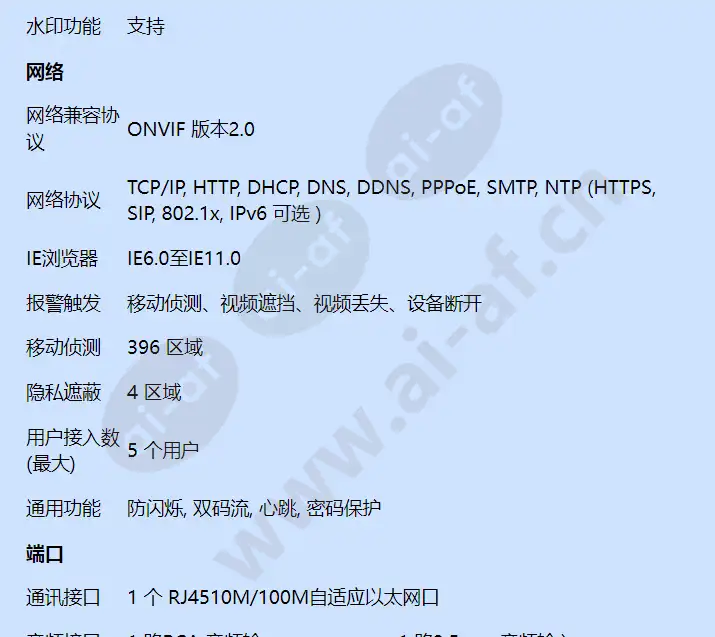 CALIPB-BI36-60_20(P) 200万像素高清红外防水网络摄像机 CALIPB-BI36-20 CALIPB-BI60-20 CALIPB-BI36-20P CALIPB-BI60-20P 产品性能 • 200 万像素1/2.8" CMOS图像传感器,高分辨率(1920x1080) • H.264视频编码压缩, 支持双码流 • 1080P实时视频输出 •3.6mm/6mm百万像素高清定焦镜头 • 红外照射距离:20-30 米 • 真实彩转黑,双滤光片切换 • 最低照度:彩色0.01Lux,黑白0.001 Lux (0 Lux, 红外灯开启) • 数字宽动态 • 移动侦测、隐私遮蔽、镜像、翻转、防闪烁 • 电源: DC12V(CALIPB-BI36/60-20),DC12V/PoE(CALIPB-BI36/60-20P) • 兼容ONVIF • 兼容CAL-CMS200管理软件 • 兼容手机远程客户端CALNVRView • 支持水印功能 规格 型号 CALIPB-BI36/60-20 CALIPB-BI36/60-20P 传感器类型 1/2.8" CMOS 有效像素 1920x1080 最低照度 彩色 0.01Lux @ ( F1.2, AGC ON ) , 0 Lux (红外灯开启) 黑白 0.001 Lux @ ( F1.2, AGC ON ) , 0 Lux (红外灯开启) 快门 自动 , 1/50(1/60)s, 1/120s, 1/250s, 1/500s, 1/1000s, 1/2000s, 1/4000s, 1/10,000s ( 毫秒可调 ) 镜头 3.6mm /6mm 百万像素高清定焦镜头 日夜转换模式 真实彩转黑 ( 双滤光片切换) 红外照射距离 20-30 米 数字宽动态 支持 自动增益 开启 / 关闭 , 0~100 可调 慢快门 无