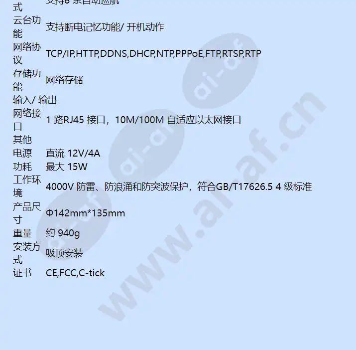 霍尼韦尔Honeywell CALISD-AI10I 10 倍130 万像素高清网络红外球型摄像机 产品特点和优势 性能特点与订购信息 产品性能 • 130 万像素1/3" CMOS 图像传感器,高分辨率(1280 x 960) • H.264 视频编码压缩, 支持双码流 • 960P 实时输出 • 内置 10 倍光学变焦镜头 • 真实彩转黑,支持IR-CUT,实现昼夜监控 • 红外距离:30 米 • 最低照度:0.001 Lux ( 黑白) • 数字宽动态、隐私遮蔽、数字降噪、白平衡 • 水平方向360º 连续旋转, 垂直方向- 2º-90º, 支持自动翻转 • 水平键控速度为0º-40º/s, 垂直键控速度为0º-40º/s • 支持50 个预置位 , 支持8 条自动巡航、 • 电源:DC12V • 4000V 防雷、防浪涌、防突波保护 • 兼容ONVIF、CAL-CMS200 管理软件、CALNVRView 手机远程客户端 • 支持对接Honeywell Black ™黑标™ CALNVR 系列网络视频录像机 CALISD-AI10I 10 倍130 万像素高清网络红外球型摄像机 技术参数 技术参数 型号 CALISD-AI10I 摄像机 图像传感器 1/3" CMOS 有效像素 1280 x 960 视频制式 PAL/NTSC 图像分辨率 主码流(1280*960)(1280*720),辅码流(D1) 最低照度 彩色0.01Lux @(F1.2,AGC ON),黑白0.001 Lux @ (F1.2,AGC ON),0 LUX with IR 数字宽动态 支持 数字降噪 3D 降噪 电子快门 1/25 – 1/10,000s 日夜模式 TDN 水印加密 支持 隐私保护 开/ 关 ( 同一画面可设置4 块隐私区域, ) 镜头 焦距 4.63~