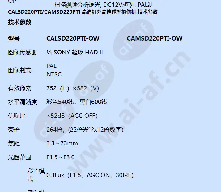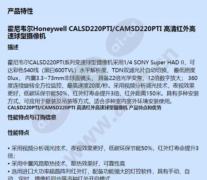 霍尼韦尔Honeywell CALSD220PTI/CAMSD220PTI 高清红外高速球型摄像机 描述 霍尼韦尔CALSD220PTI系列变速球型摄像机采用1/4 SONY Super HAD II,可达彩色540线(黑白600TVL)水平解析度,TDN双滤光片自动切换, 最低照度0lux, 内置3.3~73mm非球面镜头, 具备22倍光学变焦,12倍数字放大; 360度连续旋转全方位监控,最高速度20度/秒。采用视频分析调光技术,夜视效果更好,低碳环保节能50%,红外灯寿命提升3倍,红外距离150米。具有多种安装方式,可应用于壁装及吊装等方式,适合多种室内室外环境安装使用。 CALSD220PTI/CAMSD220PTI 高清红外高速球型摄像机 产品特点和优势 性能特点与订购信息 性能特点 • 采用视频分析调光技术,夜视效果更好,低碳环保节能50%,红外灯寿命提升3倍; • 采用中置风路散热技术,散热效果好,可靠性高 • 选用进口大功率超晶阵列红外灯,配备功能强大的灯控软件,具有手动、自动、定时、摄像机同步等多种红外开启模式 • 6寸全压铸铝球壳和全铝球体散热器设计,配备侧装式电源盒一体化防水支架,造型美观,施工方便 • 中英文OSD菜单,内置二级字库,支持中文输入、坐标和方位显示,支持红外功率、温度、风扇状态等显示 • 模块化电路设计,支持通讯状态检测和红外灯故障检测,支持波特率和控制协议自动识别,支持软地址设置自动变焦锁定速度,速度与变焦范围联动 • 视频分析功能,可对设定区域进行入侵检测和越界检测,当侦测有人或物体入侵事件发生时,自动提示并联动报警输出 订购信息 CALSD220PTI-OW 室内/室外壁装, 22倍光学变焦,12倍数字变焦,最低照度0Lux,红外距离100-120米, 预置位速度20°/秒,256预置位,8条巡航,4条花样扫描,视频分析调光