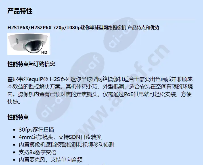 霍尼韦尔 Honeywell H2S1P6X 720p/1080p 迷你半球网络摄像机
