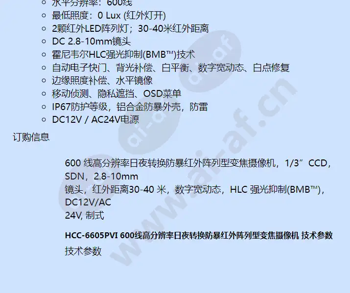 霍尼韦尔Honeywell HCC-6605PVI 600线高分辨率日夜转换防暴红外阵列型变焦摄像机 产品特点和优势 性能特点与订购信息 性能特点 应用领域 霍尼韦尔HCC-6605PVI摄像机拥有600线超高分辨率图像、日夜转换、HLC强光抑制(BMB™)、2颗红外LED阵列灯和IP67防护等级,非常适合于为商场、酒店、写字楼、金融机构、出入口、停车场、高速公路等需要高分辨率和高检测灵敏度的领域提供高品质监控解决方案。 特点 1/3" SONY Super HAD II CCD传感器 水平分辨率:600线 最低照度:0 Lux (红外灯开) 2颗红外LED阵列灯;30-40米红外距离 DC 2.8-10mm镜头 霍尼韦尔HLC强光抑制(BMB™)技术 自动电子快门、背光补偿、白平衡、数字宽动态、白点修复 边缘照度补偿、水平镜像 移动侦测、隐私遮挡、OSD菜单 IP67防护等级,铝合金防暴外壳,防雷 DC12V / AC24V电源 订购信息 HCC-6605PVI 600 线高分辨率日夜转换防暴红外阵列型变焦摄像机,1/3”CCD,SDN,2.8-10mm 镜头,红外距离30-40 米,数字宽动态,HLC 强光抑制(BMB™),DC12V/AC 24V, 制式 HCC-6605PVI 600线高分辨率日夜转换防暴红外阵列型变焦摄像机 技术参数 技术参数 型号 HCC-6605PVI 成像器件 1/3" SONY Super HAD II CCD 有效像素 PAL:752(H)×582(V) 分辨率 600线 最低照度 0 Lux (红外灯开) 红外灯 高功率红外LED阵列灯x2 红外距离 30-40米 红外灯控制 照度低于3 Lux时红外灯开 同步系统 内同步 扫描系统 2:1 隔行扫描 信噪比 大于 48dB(AGC关闭) 镜头 直流2.8-10mm 电子快门 自动/ 防