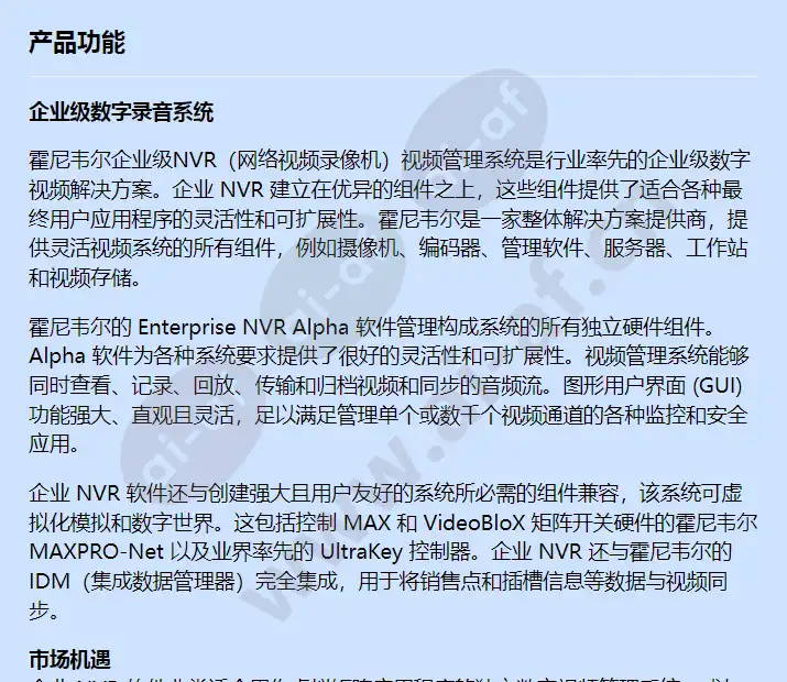 企业级数字录音系统 霍尼韦尔企业级NVR(网络视频录像机)视频管理系统是行业率先的企业级数字视频解决方案。企业 NVR 建立在优异的组件之上,这些组件提供了适合各种最终用户应用程序的灵活性和可扩展性。霍尼韦尔是一家整体解决方案提供商,提供灵活视频系统的所有组件,例如摄像机、编码器、管理软件、服务器、工作站和视频存储。 霍尼韦尔的 Enterprise NVR Alpha 软件管理构成系统的所有独立硬件组件。 Alpha 软件为各种系统要求提供了很好的灵活性和可扩展性。视频管理系统能够同时查看、记录、回放、传输和归档视频和同步的音频流。图形用户界面 (GUI) 功能强大、直观且灵活,足以满足管理单个或数千个视频通道的各种监控和安全应用。 企业 NVR 软件还与创建强大且用户友好的系统所必需的组件兼容,该系统可虚拟化模拟和数字世界。这包括控制 MAX 和 VideoBloX 矩阵开关硬件的霍尼韦尔 MAXPRO-Net 以及业界率先的 UltraKey 控制器。企业 NVR 还与霍尼韦尔的 IDM(集成数据管理器)完全集成,用于将销售点和插槽信息等数据与视频同步。 市场机遇 企业 NVR 软件非常适合用作虚拟矩阵应用程序的独立数字视频管理系统,或与霍尼韦尔模拟矩阵一起用于混合解决方案。安全和监控操作员受益于强大的用户界面,可以在不影响性能的情况下即时访问视频记录。该软件在游戏行业的一些最大和最苛刻的应用程序中经过现场测试和验证。 五台操作:“现场”观看、“回放”观看、录像、视音频录制及传输。 作为一个集成系统管理 1 到 3000 多个视频通道和超过 PB 的硬盘存储 在系统扩展时保持高水平的性能 支持行业率先的 IP 和百万像素摄像机 安全的视频格式和多级用户密码防止未经授权的访问 用于创建自动事件响应和例行动作的强大脚本语言 基于 Microsoft Windows®