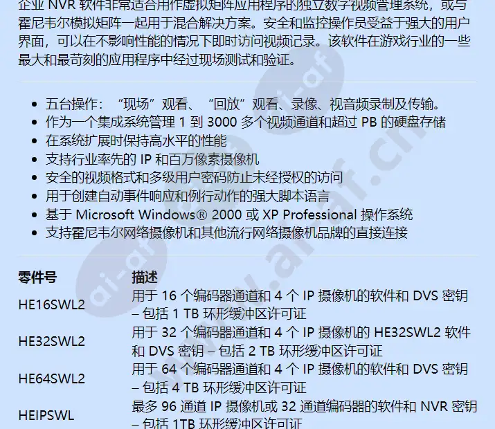 霍尼韦尔 Honeywell HE64SWL2 软件和 DVS 密钥 适用于 64 个编码器通道和 4 个 IP 摄像机 包括 4 TB 环形缓冲区许可证