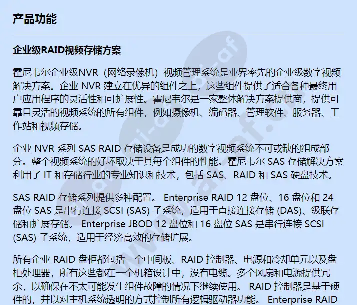 企业级RAID视频存储方案 霍尼韦尔企业级NVR(网络录像机)视频管理系统是业界率先的企业级数字视频解决方案。企业 NVR 建立在优异的组件之上,这些组件提供了适合各种最终用户应用程序的灵活性和可扩展性。霍尼韦尔是一家整体解决方案提供商,提供可靠且灵活的视频系统的所有组件,例如摄像机、编码器、管理软件、服务器、工作站和视频存储。 企业 NVR 系列 SAS RAID 存储设备是成功的数字视频系统不可或缺的组成部分。整个视频系统的好坏取决于其每个组件的性能。霍尼韦尔 SAS 存储解决方案利用了 IT 和存储行业的专业知识和技术,包括 SAS、RAID 和 SAS 硬盘技术。 SAS RAID 存储系列提供多种配置。 Enterprise RAID 12 盘位、16 盘位和 24 盘位 SAS 是串行连接 SCSI (SAS) 子系统,适用于直接连接存储 (DAS)、级联存储和扩展存储。 Enterprise JBOD 12 盘位和 16 盘位 SAS 是串行连接 SCSI (SAS) 子系统,适用于经济高效的存储扩展。 所有企业 RAID 盘柜都包括一个中间板、RAID 控制器、电源和冷却单元以及盘柜处理器,所有这些都在一个机箱设计中,没有电缆。多个风扇和电源提供冗余,以确保在不太可能发生组件故障的情况下继续使用。 RAID 控制器是基于硬件的,并以对主机系统透明的方式控制所有逻辑驱动器功能。 Enterprise RAID 在计算机操作系统中显示为一个或多个标准 SCSI 驱动器。 市场机遇 Enterprise NVR 系列 SAS RAID 存储提供视频存储容量的经济高效平衡,满足企业级数字视频系统严格的数据可用性要求。此SAS RAID 解决方案适用于各种应用程序,并具有存储来自大量摄像机的视频数据的原始容量。企业 NVR 系列 RAID 存储有助于确保视频在最需要的