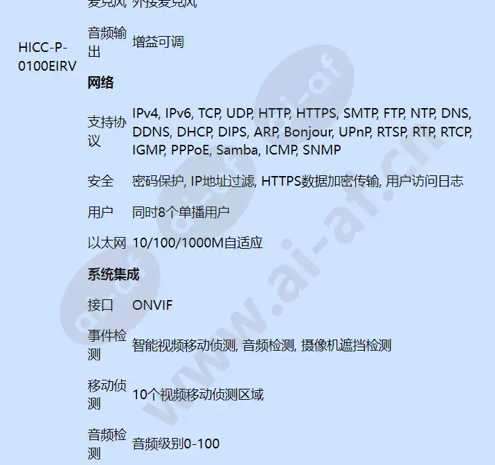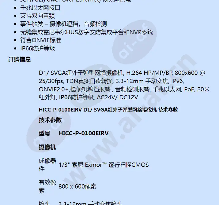 HICC-P-0100EIRV D1/ SVGA红外子弹型网络摄像机 产品特点和优势 性能特点与订购信息 应用领域 霍尼韦尔HICC-P-0100EIRV支持D1/SVGA @ 25/30fps实时视频、H.264压缩、内置红外灯、PoE以太网供电及ONVIF接口,即使在有限带宽的环境下仍能呈现超高画质画面。非常适用于地铁、银行、铁路、金融机构、政府大楼、机场等高安全等级监控领域。 主要特性 D1 @ 25/30fps;SVGA @ 25/30fps H.264/ MPEG4/ MJPEG 同时三码流 H.264 High Profile – 高效压缩,有效节省带宽与存储空间 内置20米红外灯 带红外滤光片的真实日夜转换 支持PoE(Power over Ethernet) 以太网供电 千兆以太网接口 支持双向音频 事件触发 – 摄像机遮挡,音频检测 无缝集成霍尼韦尔HUS数字安防集成平台和NVR系统 符合ONVIF标准 IP66防护等级 订购信息 HICC-P-0100EIRV D1/ SVGA 红外子弹型网络摄像机 , H.264 HP/MP/BP, 800x600 @ 25/30fps, TDN 真实日夜转换 , 3.3-12mm 手动变焦 , IPv6, ONVIF2.0+, 摄像机 遮挡报警 , 音频检测报警 , 千兆以太网 , PoE, 20 米红外灯 , IP66 防护等级 , AC24V/ DC12V HICC-P-0100EIRV D1/ SVGA红外子弹型网络摄像机 技术参数 技术参数 型号 HICC-P-0100EIRV 摄像机 成像器件 1/3" 索尼 Exmor™ 逐行扫描 CMOS 有效像素 800 x 600 像素 镜头 3.3-12mm 手动变焦镜头 光圈 直流电 驱动自动光圈 日夜模式 TDN ,红外滤光片 最低照度 彩色 0.1Lux