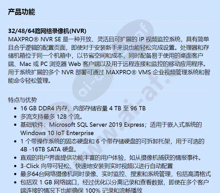 32/48/64路网络录像机(NVR) MAXPRO® NVR SE 是一种开放、灵活且可扩展的 IP 视频监控系统,具有简单且合乎逻辑的配置页面,即使对于安装新手来说也能轻松完成设置。处理器和存储机箱位于同一个机箱中,以节省空间和成本,同时配备易于使用的桌面客户端、Mac 或 PC 浏览器 Web 客户端以及用于远程连接和监控的移动应用程序。用于系统扩展的多个 NVR 部署可通过 MAXPRO® VMS 企业视频管理系统和智能命令轻松管理。 特点与优势 16 GB DDR4 内存,内部存储容量 4 TB 至 96 TB 多流支持最多 128 个流。 基础软件:Microsoft SQL Server 2019 Express;适用于嵌入式系统的 Windows 10 IoT Enterprise 1 个带操作系统的固态硬盘和 6 个带存储硬盘的可拆卸托架,用于可选的 4B -16TB SATA 硬盘。 直观的用户界面提供功能丰富的用户体验,如从摄像机捕获的情报事件。 3-Click 向导可轻松、快速地安装到实时视频以进行自动配置 最多64台网络摄像机同时录像、实时监控、搜索和系统管理,包括高清格式 包括双 1 GB 网络端口,经过优化以分离记录和查看数据,即使在多个客户端连接的情况下也能确保 100% 记录和流畅播放 2U 机架安装套件,包括锁定前挡板。包含用于四柱式货架系统的货架导轨 符合 NDAA 第 889 条 认证 ONVIF 配置文件 S、G PSIA 排放:FCC 第 15 部分,B 子部分,B 类 安全:ANSI/UL 60950-1; CAN/CSA C22.2 号 60950-1 MAXPRO NVR SE HNMSE16D02T 2 TB,16 通道,1 x 2 TB HNMSE16D04T 4 TB,16 通道,1 x 4 TB
