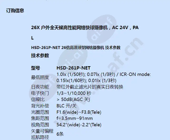 HSD-261P-NET 26倍高速球型网络摄像机 产品特点和优势 性能特点与订购信息 性能特点 • 26倍光学变焦,12倍数字变焦(共312倍变焦) • 4CIF分辨率,25帧实时视频下支持多达8个用户同时访问 • IP66 等级认证,内置加热器和风扇 • 高速:水平0.1~300°/秒, 垂直速度120°/秒,定位精度+/-0.1° • 强大记忆功能,128个预置位,3条120秒自学习路径 • 内建Web Server,易于使用和配置 • 兼容HUS平台软件,支持HJC5000控制键盘 订购信息 HSD-261P-NET 26X 户外全天候高性能网络快球摄像机,AC 24V,PA L HSD-261P-NET 26倍高速球型网络摄像机 技术参数 技术参数 型号 HSD-261P-NET 最低照度 1.0lx (1/50秒); 0.07lx (1/3秒) / ICR-ON mode: 0.15lx(1/60秒); 0.01lx (1/3秒) 日夜功能 带红外截止滤光片的真实日夜转换 电子快门 1/3~1/10,000 秒 信噪比 > 50dB(AGC 关) 背光补偿 BLC 开/关 光圈范围 F1.6(wide)~F3.8(Tele) 焦距范围 f=3.5mm~91mm 视角范围 54.2°(wide)-2.2°(Tele) 矢量可编程巡航路径 6条 水平角度 360° 持续旋转 垂直角度 0° ~90° 水平速度 0。 1°~300°/秒 垂直速度 0。 1°~120°/秒 预置位速度 360°/Sec 定位精度 0.1° 预置位 最大128个预置位 自动扫描 ON/OFF 白平衡 手动/自动/室内/室外/ATW 变焦 26倍光学, 12倍数字变焦,共312倍变焦 花样扫描 3条自定义,120秒 控制协议 Pelco D/P 电源 24VAC 2A 60Hz/50Hz