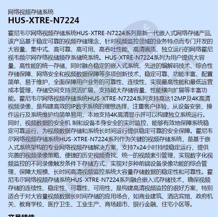 网络视频存储系统 HUS-XTRE-N7224 霍尼韦尔网络视频存储系统HUS-XTRE-N7224系列是新一代嵌入式网络存储产品, 该产品基于稳定可靠的视频存储理念,针对视频监控领域的业务特点而专门开发的大容量、集中式、高可靠、高可用、高吞吐性能、高清画质、独立运行的网络霍尼视韦频尔网存络视储频存系储统系统。HUS-XTRE-N7224系列为用户提供大容量、高性能的统一存储,同时融合稳定的嵌入式系统、先进的编解码技术、综合性存储保障、网络安全和视频数据保障等多项创新技术,稳定可靠、功能丰富、配置简单、易于维护,全面保障用户业务的可靠性、连续性,实现最高性能和最低运营成本管理,存储空间支持灵活扩展,支持超大存储容量、性能横向扩展等丰富功能。霍尼韦尔网络视频存储系统HUS-XTRE-N7224系列支持高达12MP及4K高清视频录像,是构建高效的IP数字系统的理想选择,注重客户体验,从设备安装、操作运行及系统维护均简单易用,本地支持4K高清显示并可以构建独立系统运行。同时,视频数据的安全机 制和设备本身安全的实时监控,能够有效地保障系统稳定可靠运行,为视频数据存储和系统长时间运行提供稳定可靠的安全保障。霍尼韦尔网络视频存储系统HUS-XTRE-N7224系列作为关键的视频存储系统,是基于嵌入式系统架构的专业网络视频存储解决方案,支持7x24小时持续稳定运行,提供完善的视频录像策略、便捷的历史视频查找、统一的视频索引管理,实现数字化视频监控的不同录像触发条件下存储方式,实现对多种前端设备录像功能的综合管理,保障大规模、长时间高清视频监控系统大容量存储数据的稳定性和可靠性。霍尼韦尔网络视频存储系统HUS-XTRE-N7224系列融合嵌入式存储技术,确保视频存储的连续性、稳定性、可靠性、可用性,是构建高清视频监控的很好方案,特别适合于对大容量视频数据长时间存储的应用场合,如商业建筑