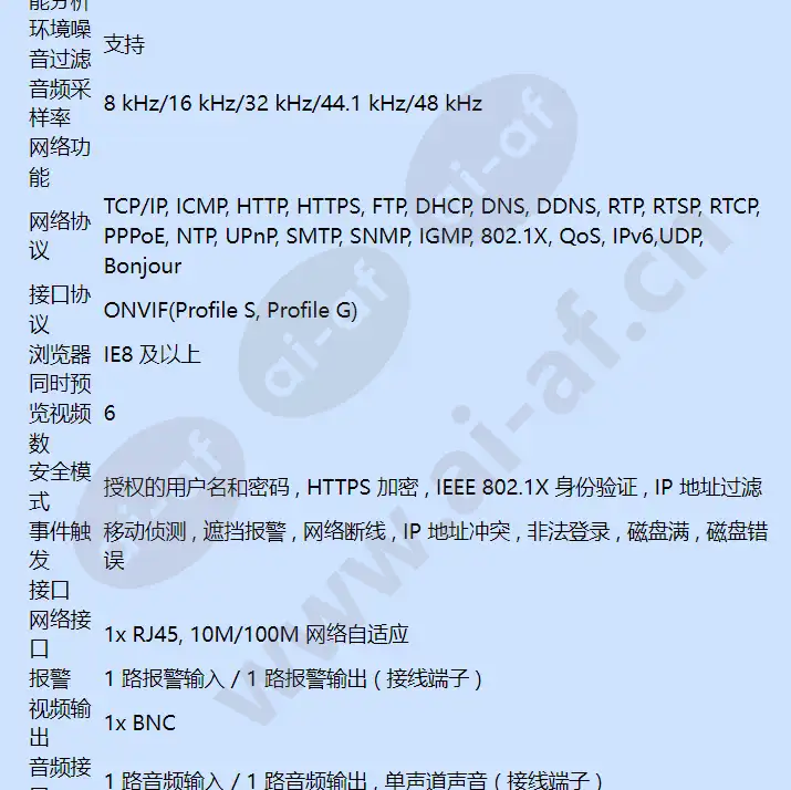 HVCB-4500IVS 4MP红外筒型网络摄像机 霍尼韦尔HVCB-4500IVS 高清红外筒型网络摄像机,结合了世界级的成像和摄像机技术与创新的IP 网络技术于一身,为用户提供了4MP 的超高画质图像。HVCB-4500IVS 高清红外筒型网络摄像机以其高质量的图像效果使其成为高级监控领域的理想解决方案。内置2.8-12mm MFZ电动变焦镜头,让用户在监控中心就能根据现场监控环境远程调节摄像机镜头焦距到很好视角。HVCB-4500IVS 内置红外灯,最大红外红外距离达60 米,在低照度或全黑环境下为用户提供清晰的黑白画面。HVCB-4500IVS 支持PoE 以太网(IEEE802.3af),可通过网线直接给网络摄像机供电,帮助用户节省电源适配器的使用,并有效降低安装成本。为增加HVCB-4500IVS 的安装灵活性,该款网络摄像机还支持DC12V 和AC24V供电。霍尼韦尔HVCB-4500IVS 支持4MP 高清视频,H.265 高效压缩,POE以太网供电及 ONVIF 接口协议,即使在有限带宽的环境下仍能呈现超高画质的高清画面。筒型外观设计使其成为各种安防、监控应用的理想选择,广泛适用于各种室内外场所,如道路、机场、学校、商场、酒店宾馆、银行网点。 1/3” 逐行扫描CMOS 支持2688 x 1520@25fps 支持H.265/ H.264/ MJPEG三种编码 真实日夜转换 真实宽动态 最大60m米红外距离 2.8 ~ 12mm MFZ电动变焦镜头 自动对焦 支持最大128GB前端存储 IP67防护等级 支持ONVIF 支持12VDC/ 24VAC/ PoE+ 三电源 技产品术型号参数HVCB-4500IVS* 注意:产品设计与产品规格若有升级、变更,恕不另行通知 图像传感器 1/3" 逐行扫描 CMOS彩色 最低照度 :0.01Lux@F1.6(AGC