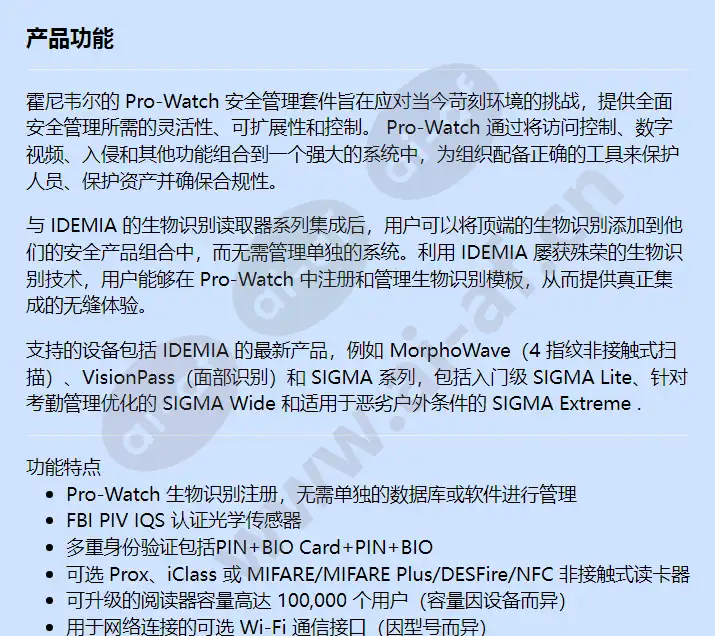 霍尼韦尔的 Pro-Watch 安全管理套件旨在应对当今苛刻环境的挑战,提供全面安全管理所需的灵活性、可扩展性和控制。 Pro-Watch 通过将访问控制、数字视频、入侵和其他功能组合到一个强大的系统中,为组织配备正确的工具来保护人员、保护资产并确保合规性。 与 IDEMIA 的生物识别读取器系列集成后,用户可以将顶端的生物识别添加到他们的安全产品组合中,而无需管理单独的系统。利用 IDEMIA 屡获殊荣的生物识别技术,用户能够在 Pro-Watch 中注册和管理生物识别模板,从而提供真正集成的无缝体验。 支持的设备包括 IDEMIA 的最新产品,例如 MorphoWave(4 指纹非接触式扫描)、VisionPass(面部识别)和 SIGMA 系列,包括入门级 SIGMA Lite、针对考勤管理优化的 SIGMA Wide 和适用于恶劣户外条件的 SIGMA Extreme . 功能特点 Pro-Watch 生物识别注册,无需单独的数据库或软件进行管理 FBI PIV IQS 认证光学传感器 多重身份验证包括PIN+BIO Card+PIN+BIO 可选 Prox、iClass 或 MIFARE/MIFARE Plus/DESFire/NFC 非接触式读卡器 可升级的阅读器容量高达 100,000 个用户(容量因设备而异) 用于网络连接的可选 Wi-Fi 通信接口(因型号而异) 提供室内室外额定型号,包括 IP65 和 IK09 额定外壳 防欺诈功能包括可选专利、BSI 认证的光电假指检测技术 率先的指纹技术被美国国家标准与技术研究院 (NIST) 评为最准确 用于阅读器配置和事务日志查看的嵌入式 Web 服务器 符合 RoHS、REACH 和 WEEE 标准 零件号 描述 SIGMALBIO SIGMA Lite Biometric Only Reader, 3