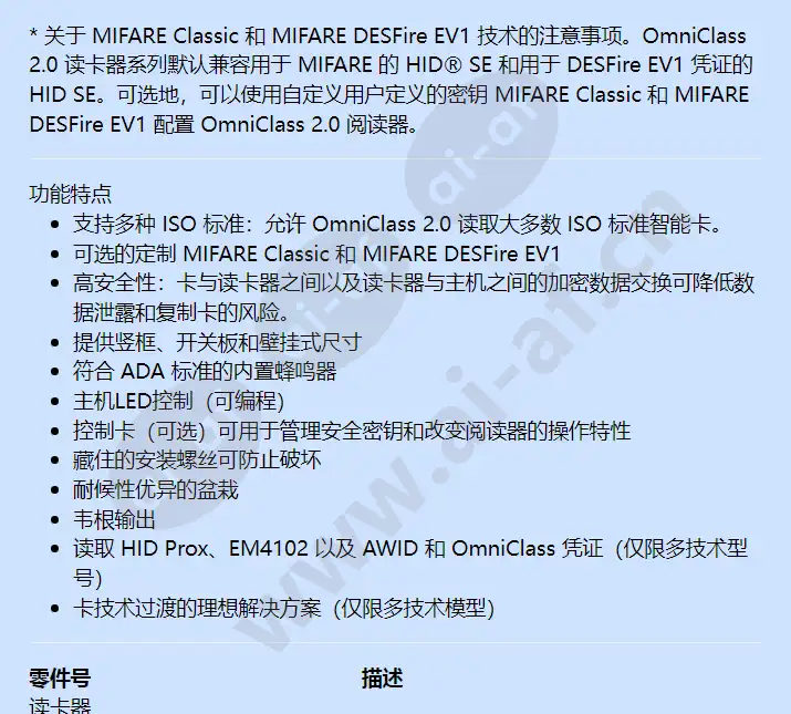 非接触式智能、多技术和低功耗蓝牙® (BLE) 读卡器 霍尼韦尔的 OmniClass™ 是一系列 13.56 MHz 非接触式安全智能卡读卡器,具有很好的可靠性、一致的读取范围和易于安装的特点。它们有多种尺寸可供选择,每个 OmniClass 读卡器都采用智能卡技术,允许用户同时支持生物识别配置文件和每张卡上的多个应用程序。 OmniClass 可以改装任何韦根输出读卡器,包括标准 HID® 或霍尼韦尔感应读卡器。 智能卡技术非常适用于访问控制、逻辑 (PC) 访问、生物识别模板的存储、停车、带有嵌入式防篡改数码照片的安全 ID、电子钱包和许多其他需要安全可靠的读/写卡的应用程序。 多技术功能 为了让客户更轻松地从 125 kHz 感应卡系统过渡到智能卡系统,该系列包括可支持 HID Prox、EM4102 和 AWID 感应技术的选项。这些多技术读卡器同时使用所有技术,并允许用户随着时间的推移过渡到智能卡,同时在单个建筑物或多个设施中结合使用多种卡技术。 此外,在使用基于加密非接触式通信的智能卡凭证时,OmniClass 读卡器系列通过相互身份验证和数据加密提供增强的安全性。无论是读取感应、OmniClass 还是多技术卡,相同的用户识别数据格式都会发送到面板,使卡上的数据对用户透明。 OmniClass 读卡器系列的优势包括: 适用于综合门禁系统: 两次连续读卡之间的快速响应时间使其适用于集成访问控制和入侵系统,在这些系统中需要在读卡器上进行三次刷卡操作才能布防系统。 更多开放: OmniClass 2.0 读卡器支持全球 13.56 MHz 智能卡技术标准,包括 OmniClass、OmniClass 2.0、iCLASS®、iCLASS SR™/SE®、iCLASS® Seos™ 以及 MIFARE Classic* 和 MIFARE DESFire EV1*。可