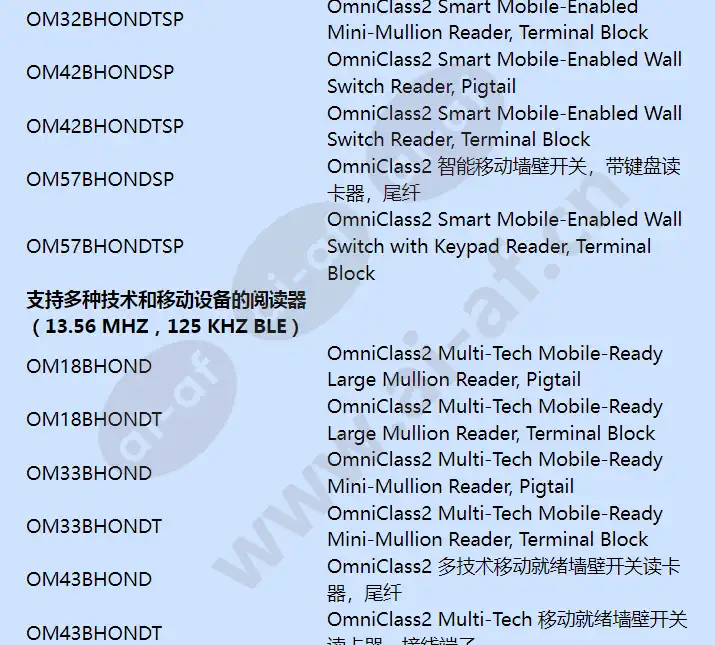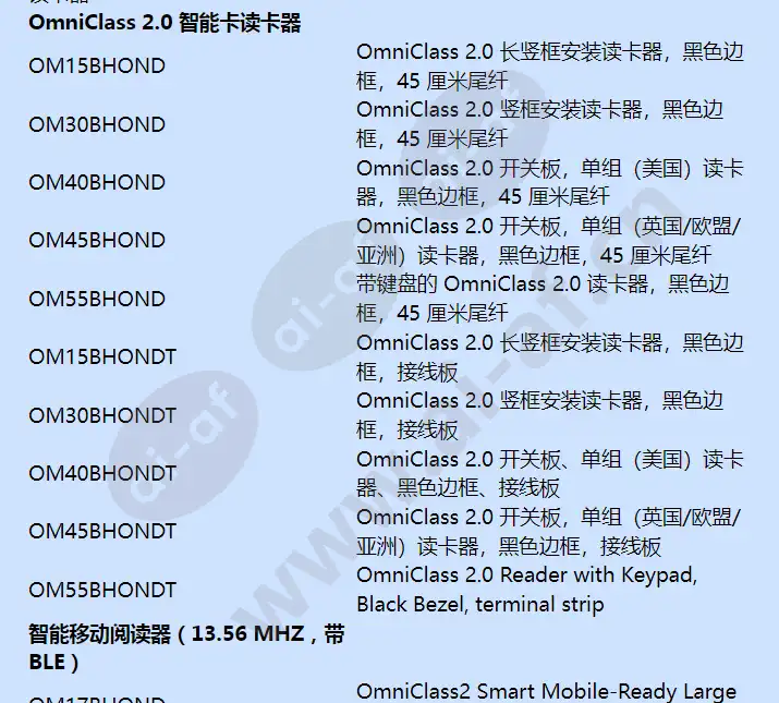 非接触式智能、多技术和低功耗蓝牙® (BLE) 读卡器 霍尼韦尔的 OmniClass™ 是一系列 13.56 MHz 非接触式安全智能卡读卡器,具有很好的可靠性、一致的读取范围和易于安装的特点。它们有多种尺寸可供选择,每个 OmniClass 读卡器都采用智能卡技术,允许用户同时支持生物识别配置文件和每张卡上的多个应用程序。 OmniClass 可以改装任何韦根输出读卡器,包括标准 HID® 或霍尼韦尔感应读卡器。 智能卡技术非常适用于访问控制、逻辑 (PC) 访问、生物识别模板的存储、停车、带有嵌入式防篡改数码照片的安全 ID、电子钱包和许多其他需要安全可靠的读/写卡的应用程序。 多技术功能 为了让客户更轻松地从 125 kHz 感应卡系统过渡到智能卡系统,该系列包括可支持 HID Prox、EM4102 和 AWID 感应技术的选项。这些多技术读卡器同时使用所有技术,并允许用户随着时间的推移过渡到智能卡,同时在单个建筑物或多个设施中结合使用多种卡技术。 此外,在使用基于加密非接触式通信的智能卡凭证时,OmniClass 读卡器系列通过相互身份验证和数据加密提供增强的安全性。无论是读取感应、OmniClass 还是多技术卡,相同的用户识别数据格式都会发送到面板,使卡上的数据对用户透明。 OmniClass 读卡器系列的优势包括: 适用于综合门禁系统: 两次连续读卡之间的快速响应时间使其适用于集成访问控制和入侵系统,在这些系统中需要在读卡器上进行三次刷卡操作才能布防系统。 更多开放: OmniClass 2.0 读卡器支持全球 13.56 MHz 智能卡技术标准,包括 OmniClass、OmniClass 2.0、iCLASS®、iCLASS SR™/SE®、iCLASS® Seos™ 以及 MIFARE Classic* 和 MIFARE DESFire EV1*。可