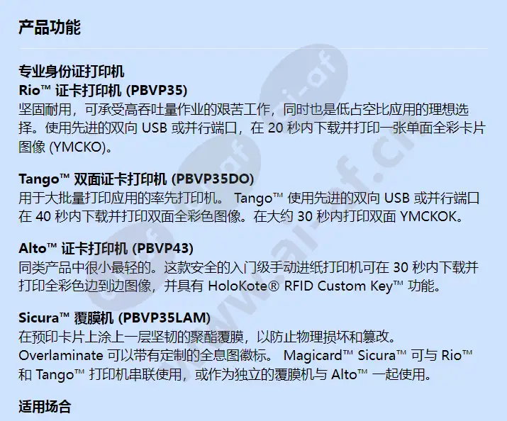 专业身份证打印机 Rio™ 证卡打印机 (PBVP35) 坚固耐用,可承受高吞吐量作业的艰苦工作,同时也是低占空比应用的理想选择。使用先进的双向 USB 或并行端口,在 20 秒内下载并打印一张单面全彩卡片图像 (YMCKO)。 Tango™ 双面证卡打印机 (PBVP35DO) 用于大批量打印应用的率先打印机。 Tango™ 使用先进的双向 USB 或并行端口在 40 秒内下载并打印双面全彩色图像。在大约 30 秒内打印双面 YMCKOK。 Alto™ 证卡打印机 (PBVP43) 同类产品中很小最轻的。这款安全的入门级手动进纸打印机可在 30 秒内下载并打印全彩色边到边图像,并具有 HoloKote® RFID Custom Key™ 功能。 Sicura™ 覆膜机 (PBVP35LAM) 在预印卡片上涂上一层坚韧的聚酯覆膜,以防止物理损坏和篡改。 Overlaminate 可以带有定制的全息图徽标。 Magicard™ Sicura™ 可与 Rio™ 和 Tango™ 打印机串联使用,或作为独立的覆膜机与 Alto™ 一起使用。 适用场合 门禁控制 会员卡 条码卡 官方通行证 商业名片 照片身份证 会员卡 访客ID 磁条卡 HoloKote™ 每台 Rio™、Tango™ 和 Alto™ 打印机均免费提供内置安全水印。为了获得最高的安全性和防伪造卡保护,可以在唯有的自定义密钥上对自定义徽标进行编程(仅限于 Alto™ 上的自定义文本)。 HoloPatch™ HoloPatch™ 卡片具有高度反光的金色“超级漫射器”贴片,与 HoloKote™ 防伪功能结合使用,以突出显示选定的徽标以提高远距离可见性。如果需要,HoloPatch™ 功能也可以应用于客户提供的代理卡。 UltraCoverplus® 两年免费保修,无任何问题的打印头和借用范围(美国和欧盟的标准)。 全