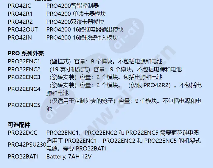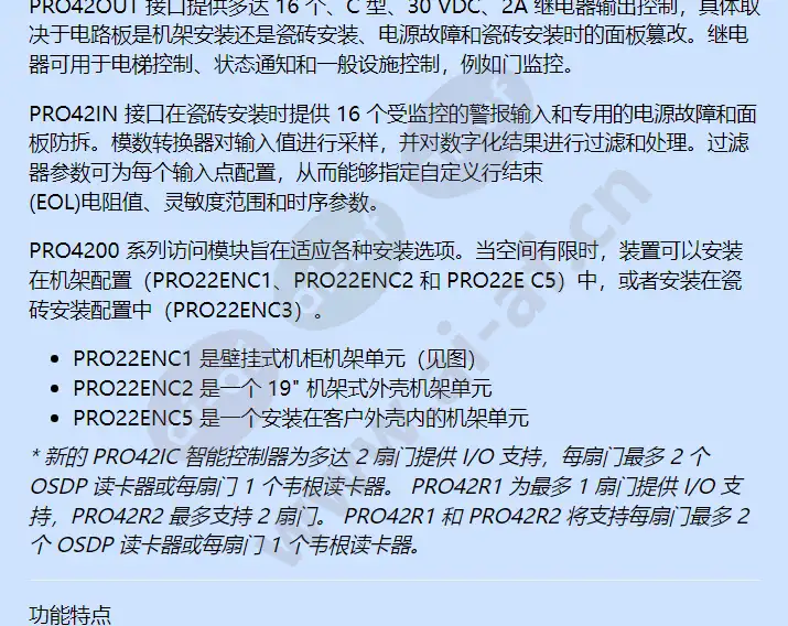 专业系列接入模块 PRO4200 专业系列门禁控制模块专为高密度安装而设计。 PRO4200 专业系列可以通过 WIN-PAK® 集成安全套件进行管理,以获得更多高级功能,例如视频集成、预先报告、规则和照片徽章、电梯控制、非接触式访问和移动凭证管理。 PRO4200 系列支持每个机柜最多 18 个门和每个智能控制器最多 34 个门以及最多 100,000 张卡容量,提供较小的安装空间和较高的每门成本比。新的 PRO42IC 智能控制器为 2 扇门提供 I/O 支持 *。 PRO42R1 提供了一个读卡器的I/O 支持,而PRO42R2 支持两个读卡器。两者都与智能控制模块(PRO42IC)接口。如果与智能控制模块的通信丢失,读卡器将根据安全需要单独配置以允许进入。此自定义允许或配置为安全、锁定和解锁。 PRO4200 模块提供最新的双向和强加密 OSDP 与访问控制读卡器的通信。对于传统和改造安装,仍支持 Wiegand 格式。 PRO42OUT 接口提供多达 16 个、C 型、30 VDC、2A 继电器输出控制,具体取决于电路板是机架安装还是瓷砖安装、电源故障和瓷砖安装时的面板篡改。继电器可用于电梯控制、状态通知和一般设施控制,例如门监控。 PRO42IN 接口在瓷砖安装时提供 16 个受监控的警报输入和专用的电源故障和面板防拆。模数转换器对输入值进行采样,并对数字化结果进行过滤和处理。过滤器参数可为每个输入点配置,从而能够指定自定义行结束 (EOL)电阻值、灵敏度范围和时序参数。 PRO4200 系列访问模块旨在适应各种安装选项。当空间有限时,装置可以安装在机架配置(PRO22ENC1、PRO22ENC2 和 PRO22E C5)中,或者安装在瓷砖安装配置中(PRO22ENC3)。 PRO22ENC1 是壁挂式机柜机架单元(见图) PRO22ENC2 是一个 19" 机