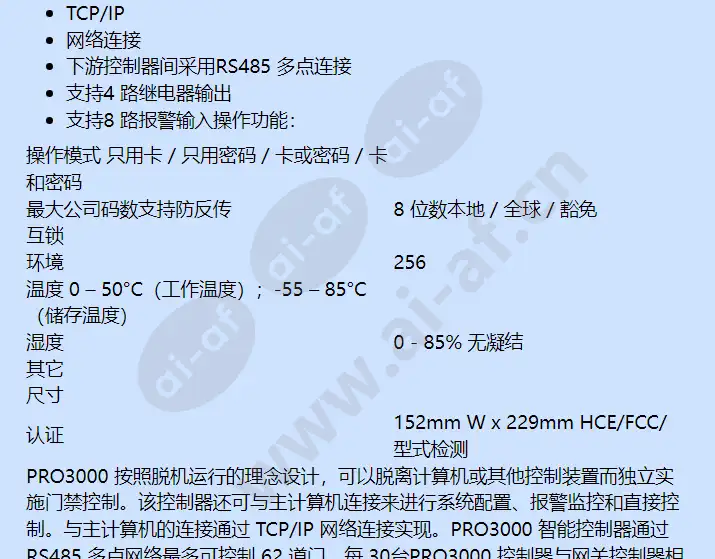 PRO3000 智能双门门禁控制器 PRO3000智能门禁控制器是一款适用于中型到大型出入口解决方案的高级门禁控制器。PRO3000 采用 32 位 CPU 结构,功能强大而灵活;支持 TCP/IP 协议;固件和大容量持卡人数据均保存在板载闪存中。 产品型号 PRO 3000 数据库持卡人容量: 事件存储容量: 100,000 持卡人及事件存储 100,000容量动态可调 支持远程升级 门禁级别: 节假日: 128 255 时区:卡格式: 127最多 128 种卡格式(Wiegand) 认证设备代码: 实时时钟: 8区分时区 支持闰年 通信 - - 主控制面板通过以太网端口与 TCP/IP 网络连接 下游控制器间采用RS485 多点连接 支持4 路继电器输出 支持8 路报警输入操作功能: 操作模式 只用卡 / 只用密码 / 卡或密码 / 卡和密码 最大公司码数支持防反传 8 位数本地 / 全球 / 豁免 互锁 环境 256 温度 0 – 50°C(工作温度);-55 – 85°C(储存温度) 湿度 0 - 85% 无凝结 其它 尺寸 认证 152mm W x 229mm HCE/FCC/ 型式检测 PRO3000 按照脱机运行的理念设计,可以脱离计算机或其他控制装置而独立实施门禁控制。该控制器还可与主计算机连接来进行系统配置、报警监控和直接控制。与主计算机的连接通过 TCP/IP 网络连接实现。PRO3000 智能控制器通过 RS485 多点网络最多可控制 62 道门,每 30台PRO3000 控制器与网关控制器相连,支持通过总线接入下游双门控制器。由于62 道门只使用一个 TCP/IP 地址,因此这种结构能够节省局域网IP 地址。PRO3000 最大支持卡片数据容量为100,000,最大事件记录容量为100,000条。PRO3000 可采用平铺式安装方式。 事务处理 真最