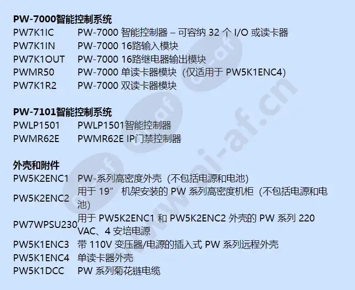 PW7000系列门禁系统是一种先进的门禁硬件架构,能够为大型企业应用提供解决方案。 智能控制器通过嵌入式 Linux 操作系统、改进的处理器和增加的内存以及为敏感数据增加额外安全层的板载加密芯片提供强大的功能和灵活性。 PW 系列控制器支持 I/O 和读卡器板的组合,以监控报警输入点、继电器输出点和与门禁读卡器的接口。通过提供模块化设计,系统可以进行定制以满足广泛的应用,同时优化成本和安装。 PW7K1IC 带有 2 个板载读卡器端口,支持多种读卡器通信协议,包括 Wiegand 和 OSDP (V2) 安全通道协议 (SCP)。现在,所有智能控制器和读卡器板硬件都支持 OSDP SCP。 PW7000 系列控制面板和 I/O 板向后兼容 PW6000 系列*。 注意:PW6K1IC 板基于 Mercury 的 EP2500,PW7K1IC 板基于 Mercury 的 LP1502,包括额外的读卡器/门连接。 PW7K1IC板有1条RS485下行总线。所有 Honeywell PW7000 Form Factor 和 Honeywell 品牌的 Mercury 板都是向后的 与现有的 PW5000/PW6000 外壳兼容。 功能特点 安全的 最新的加密标准支持 TLS1.2 和 OSDP (V2) 安全通道协议 嵌入式加密存储芯片保护敏感数据 多才多艺的 向后兼容 PW6000* 控制器、读卡器板、I/O 板和外壳* 板载支持最多 2 个读卡器(2 门)用于 PW7K1IC 和最多 2 个读卡器(1 门)用于 PWLP1501 综合的 各种本地集成,包括无线锁 广泛的自定义,包括 If / Then 宏功能 适应 模块化设计允许混合使用控制器和下游板以满足最苛刻的客户要求 PWLP1501 和 PWMR62E 的灵活电源选项,包括 PoE 和 PoE+ 零件号 描述