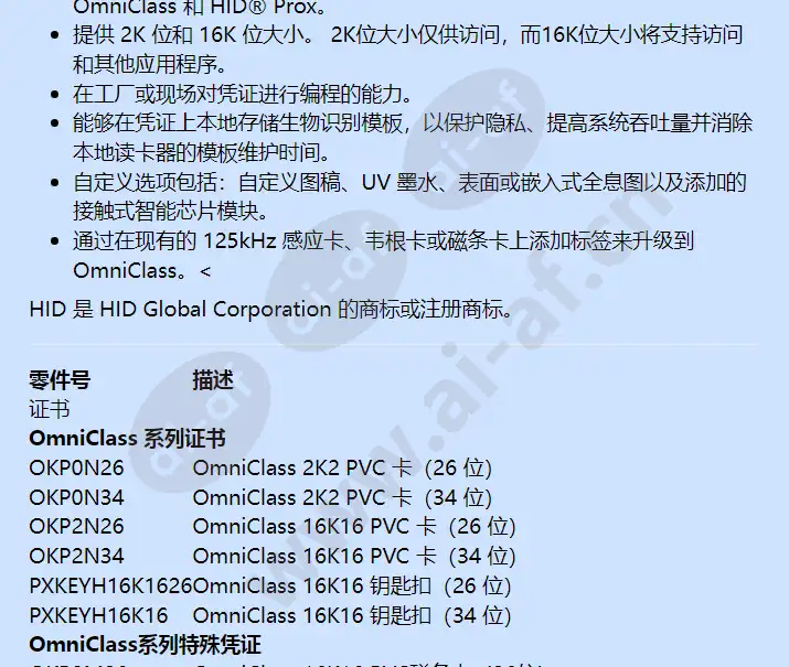 霍尼韦尔的 OmniClass™ 证书旨在与 OmniClass 阅读器配合使用。 OmniClass 产品线基于 13.56MHz 技术,基于 RFID 并提供出色的非接触式感应范围(高达 4.5")。 OmniClass 卡片是层压 PVC 卡片,可以使用热升华或热转印卡片打印机进行双面打印。它们也可以在短边上打孔以用于垂直方向(纵向)。 除了 OmniClass 卡外,还提供密钥卡和贴纸。坚固耐用的模制钥匙扣包括一个用于大多数钥匙圈或徽章夹的插槽。贴纸是薄而扁平的聚碳酸酯圆盘,具有工业粘合剂背衬。这些贴纸不可移除,可以贴在现有 125kHz 感应卡、韦根或磁条门禁卡、PDA 的非金属表面、手机、公文包和其他个人物品的背面。 OmniClass 凭据以流行的配置存储。用户需要选择站点代码和卡号时可以进行特殊订单,也可以定制卡订单。 霍尼韦尔可以帮助您创建满足您审美和防伪需求的定制凭证。防伪选项包括紫外线 (UV) 荧光油墨、全息图和公司徽标。 功能特点 多技术卡配置可用于帮助规划迁移并在同一张卡上支持多个系统,例如 OmniClass 和 HID® Prox。 提供 2K 位和 16K 位大小。 2K位大小仅供访问,而16K位大小将支持访问和其他应用程序。 在工厂或现场对凭证进行编程的能力。 能够在凭证上本地存储生物识别模板,以保护隐私、提高系统吞吐量并消除本地读卡器的模板维护时间。 自定义选项包括:自定义图稿、UV 墨水、表面或嵌入式全息图以及添加的接触式智能芯片模块。 通过在现有的 125kHz 感应卡、韦根卡或磁条卡上添加标签来升级到 OmniClass。 < HID 是 HID Global Corporation 的商标或注册商标。 零件号 描述 证书 OmniClass 系列证书 OKP0N26 OmniClass 2K2 PVC 卡(26 位)