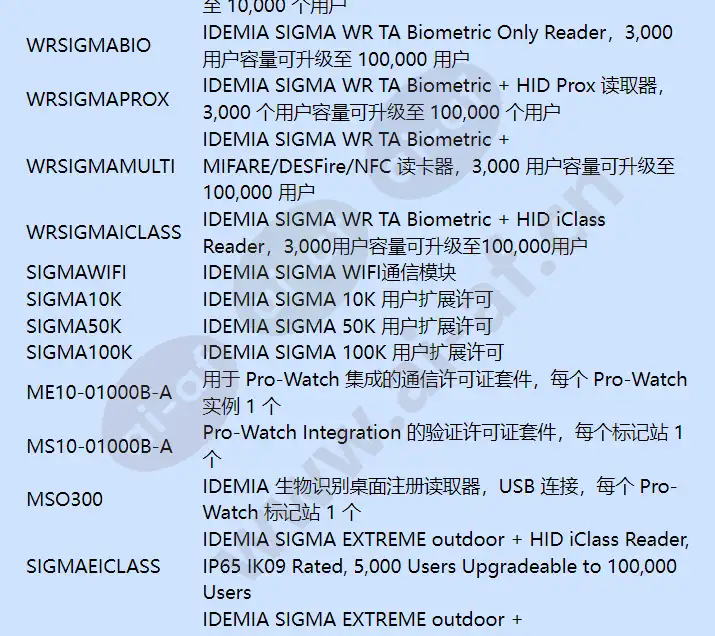 霍尼韦尔的 Pro-Watch 安全管理套件旨在应对当今苛刻环境的挑战,提供全面安全管理所需的灵活性、可扩展性和控制。 Pro-Watch 通过将访问控制、数字视频、入侵和其他功能组合到一个强大的系统中,为组织配备正确的工具来保护人员、保护资产并确保合规性。 与 IDEMIA 的生物识别读取器系列集成后,用户可以将顶端的生物识别添加到他们的安全产品组合中,而无需管理单独的系统。利用 IDEMIA 屡获殊荣的生物识别技术,用户能够在 Pro-Watch 中注册和管理生物识别模板,从而提供真正集成的无缝体验。 支持的设备包括 IDEMIA 的最新产品,例如 MorphoWave(4 指纹非接触式扫描)、VisionPass(面部识别)和 SIGMA 系列,包括入门级 SIGMA Lite、针对考勤管理优化的 SIGMA Wide 和适用于恶劣户外条件的 SIGMA Extreme . 功能特点 Pro-Watch 生物识别注册,无需单独的数据库或软件进行管理 FBI PIV IQS 认证光学传感器 多重身份验证包括PIN+BIO Card+PIN+BIO 可选 Prox、iClass 或 MIFARE/MIFARE Plus/DESFire/NFC 非接触式读卡器 可升级的阅读器容量高达 100,000 个用户(容量因设备而异) 用于网络连接的可选 Wi-Fi 通信接口(因型号而异) 提供室内室外额定型号,包括 IP65 和 IK09 额定外壳 防欺诈功能包括可选专利、BSI 认证的光电假指检测技术 率先的指纹技术被美国国家标准与技术研究院 (NIST) 评为最准确 用于阅读器配置和事务日志查看的嵌入式 Web 服务器 符合 RoHS、REACH 和 WEEE 标准 零件号 描述 SIGMALBIO SIGMA Lite Biometric Only Reader, 3