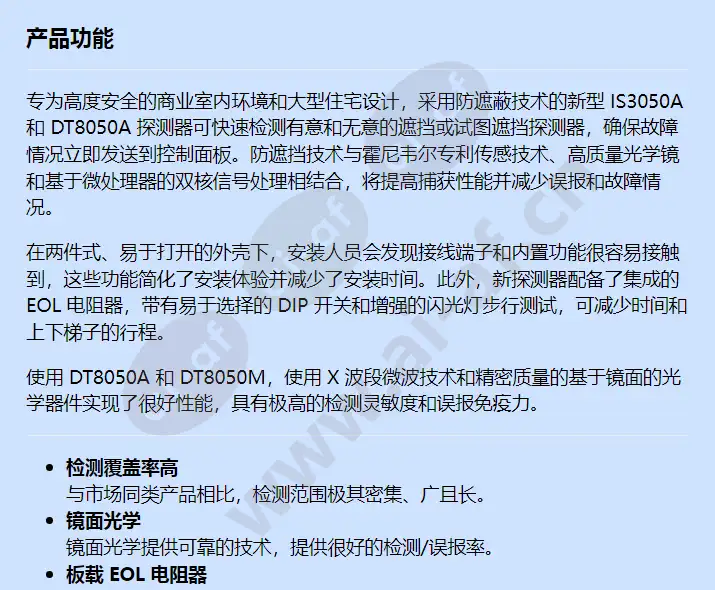 专为高度安全的商业室内环境和大型住宅设计,采用防遮蔽技术的新型 IS3050A 和 DT8050A 探测器可快速检测有意和无意的遮挡或试图遮挡探测器,确保故障情况立即发送到控制面板。防遮挡技术与霍尼韦尔专利传感技术、高质量光学镜和基于微处理器的双核信号处理相结合,将提高捕获性能并减少误报和故障情况。 在两件式、易于打开的外壳下,安装人员会发现接线端子和内置功能很容易接触到,这些功能简化了安装体验并减少了安装时间。此外,新探测器配备了集成的 EOL 电阻器,带有易于选择的 DIP 开关和增强的闪光灯步行测试,可减少时间和上下梯子的行程。 使用 DT8050A 和 DT8050M,使用 X 波段微波技术和精密质量的基于镜面的光学器件实现了很好性能,具有极高的检测灵敏度和误报免疫力。 检测覆盖率高 与市场同类产品相比,检测范围极其密集、广且长。 镜面光学 镜面光学提供可靠的技术,提供很好的检测/误报率。 板载 EOL 电阻器 无需为区域监控添加外部电阻。只需拨动 DIP 开关以适合您的控制面板。 可拆卸端子排 我们新的、易于访问的可拆卸连接器提供灵活的接线,并在安装过程中更容易安装。 数字自适应微波阈值 DT8050A 和 DT8050M 以数字方式调整阈值以解决吊扇和其他重复移动物体等房间干扰。结果——即使在“活动”房间内也能出色地避免误报。 自检专利方案 检测器通过发送和接收测试信号定期测试整个微波电路。如果出现任何异常,检测器会触发防遮挡/故障继电器。 高级双核信号处理 (DUAL TEC) 支持多种高级功能,包括并发诊断、数字荧光干扰滤波器、数字自适应微波阈值、自适应基线和双向温度补偿。 很好的红外线防遮挡保护 高灵敏度的主动红外防遮挡功能可以轻松检测到阻塞、喷洒或阻碍探测器的尝试。 被动红外抗白光 获得专利的黑色防虫罩通过提供 6,500 勒克斯的白光免疫力来减少误报