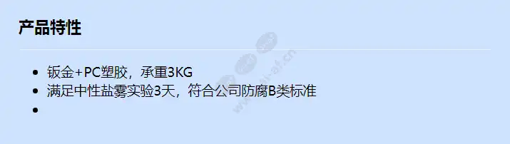 钣金+PC塑胶,承重3KG 满足中性盐雾实验3天,符合公司防腐B类标准 防腐等级 B类 净重 0.52KG 毛重 0.6KG 产品尺寸 Ø200x110mm 包装尺寸 250x230x110mm 适用场景 室内嵌入式安装(适用于半球) 抗振动标准 符合GB15211-2014 材料 钣金+PC塑胶 承重 3KG 安装方式 嵌入式安装