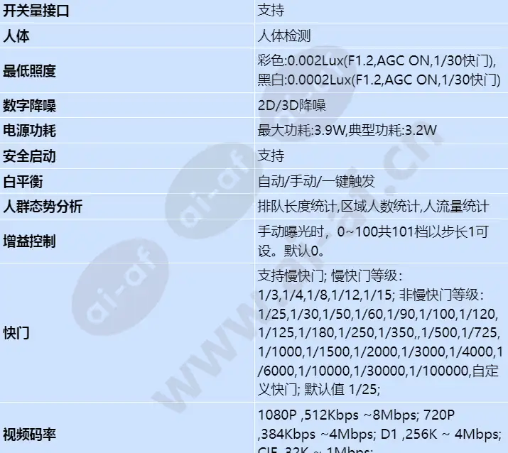 支持1 TOPS算力; 支持行为分析、人群态势分析、目标、人体; 采用1/2.7" CMOS; 120dB超级宽动态,强反差场景还原真实细节; 行为分析视频模式 快速移动检测,越线检测,入侵检测,区域进入/离开检测,徘徊检测 人群态势分析 排队长度统计,区域人数统计,人流量统计 人体 人体检测 算力 1 TOPS 分辨率 2MP 1920(横)* 1080(竖) Sensor感光面尺寸 1 / 2.7英寸CMOS 最低照度 彩色:0.002Lux(F1.2,AGC ON,1/30快门),黑白:0.0002Lux(F1.2,AGC ON,1/30快门) 视频编码格式 MJPEG/H.265 视频帧率 30/25fps可设置 音频编码格式 G.711a/G.711u/G.726/OPUS/AAC RS485接口 支持 开关量接口 支持 以太网络接口 支持 以太网络接口数量 1个 以太网络接口带宽 1个RJ45 10M/100M以太网口 电源类型 AC24V,DC12V,PoE(802.3af) 电源功耗 最大功耗:3.9W,典型功耗:3.2W 工作温度 -30°C~60°C 工作湿度 5%~95%(无冷凝) 镜头光圈类型 DC-Iris(驱动阻抗≥190ohm;制动阻抗≥500ohm) 防雷防浪涌 4kV 整机重量 0.54kg 包装重量 0.7kg 整机尺寸 78.0mmx62.5mmx149.2mm(不含镜头) 包装尺寸 230mm×125mm×108mm SD接口支持最大容量 提供MicroSD卡插槽,支持MicroSDHC/MicroSDXC,支持最大容量256GB内存卡 音频输入接口 支持(1路LINE IN或1路外置MIC) 音频输出接口 支持(1路LINE OUT) 视频编码路数 三码流 主码流分辨率 1920x1080(1080P)
