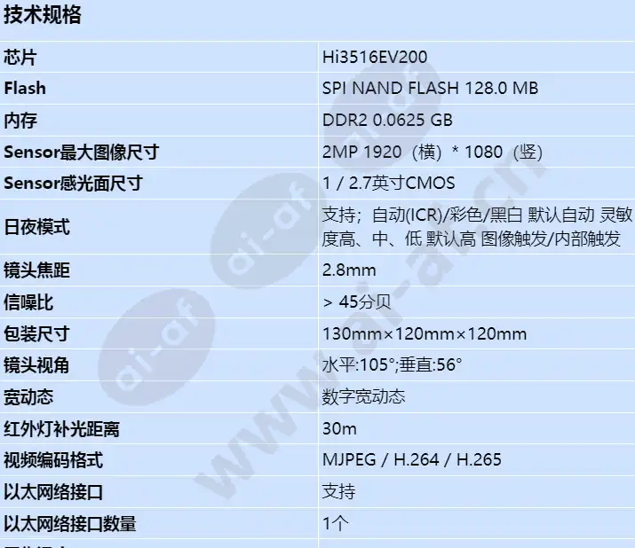 采用1/2.7" CMOS; 数字宽动态超级宽动态,强反差场景还原真实细节; 芯片 Hi3516EV200 内存 DDR2 0.0625 GB Flash SPI NAND FLASH 128.0 MB Sensor最大图像尺寸 2MP 1920(横)* 1080(竖) Sensor感光面尺寸 1 / 2.7英寸CMOS 最低照度 彩色:0.009Lux(F1.2,AGC ON,1/30快门),黑白:0.0025Lux(F1.2,AGC ON,1/30快门),0Lux(红外开启) 镜头焦距 2.8mm 镜头视角 水平:105°;垂直:56° 红外灯补光距离 30m 视频编码格式 MJPEG / H.264 / H.265 以太网络接口 支持 以太网络接口数量 1个 以太网络接口带宽 1个RJ45 10M/100M自适应以太网口 电源类型 DC12V 电源功耗 最大功耗:3.6W,典型功耗:1.4W 工作温度 -30°C~55°C 工作湿度 5%~95%(无冷凝) 防护等级 IP66 快门 支持慢快门; 慢快门等级:1/3,1/4,1/8,1/12,1/15; 非慢快门等级:1/25,1/30,1/50,1/60,1/90,1/100,1/120,1/125,1/180,1/250,1/350,,1/500,1/725,1/1000,1/1500,1/2000,1/3000,1/4000,1/6000,1/10000,1/30000,1/100000,自定义快门; 默认值 1/25; 日夜模式 支持;自动(ICR)/彩色/黑白 默认自动 灵敏度高、中、低 默认高 图像触发/内部触发 增益控制 手动曝光时,0~100共101档以步长1可设。默认0。 白平衡 自动/手动/一键触发 数字降噪 2D/3D降噪 宽动态 数字宽动态 强光抑制 支持 视频防抖 不支持功能; 不支持灵敏度