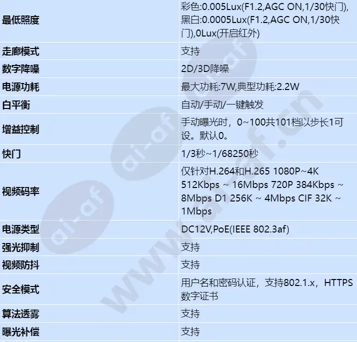 采用1/2.7" CMOS; 120dB超级宽动态,强反差场景还原真实细节; 芯片 Hi3516AV100 内存 DDR3 0.5 GB Flash SPI NAND FLASH 128.0 MB Sensor最大图像尺寸 5MP 2560(横)* 1920(竖) Sensor感光面尺寸 1/2.7" 最低照度 彩色:0.005Lux(F1.2,AGC ON,1/30快门),黑白:0.0005Lux(F1.2,AGC ON,1/30快门),0Lux(开启红外) 镜头焦距 2.8mm 镜头视角 水平:97.3°;垂直:70.7° 红外灯补光距离 30m 视频编码格式 MJPEG / H.264 / H.265 以太网络接口 支持 以太网络接口数量 1个 以太网络接口带宽 1个RJ45 10M/100M自适应以太网口 电源类型 DC12V,PoE(IEEE 802.3af) 电源功耗 最大功耗:7W,典型功耗:2.2W 工作温度 -30°C~60°C(补光灯关闭) -30°C~40°C(补光灯开启) 工作湿度 5%~95%(无冷凝) 防护等级 IP66 Sensor最大图像尺寸 5MP 2560(横)* 1920(竖) Sensor感光面尺寸 1/2.7" 最低照度 彩色:0.005Lux(F1.2,AGC ON,1/30快门),黑白:0.0005Lux(F1.2,AGC ON,1/30快门),0Lux(开启红外) 快门 1/3秒~1/68250秒 日夜模式 自动(ICR)/彩色/黑白 增益控制 手动曝光时,0~100共101档以步长1可设。默认0。 白平衡 自动/手动/一键触发 数字降噪 2D/3D降噪 宽动态 120分贝 强光抑制 支持 视频防抖 支持 算法透雾 支持 曝光补偿 支持 曝光模式 支持 信噪比 > 45分贝 畸变矫正 支持 走廊模式 支持 图像矫正 支持图像镜