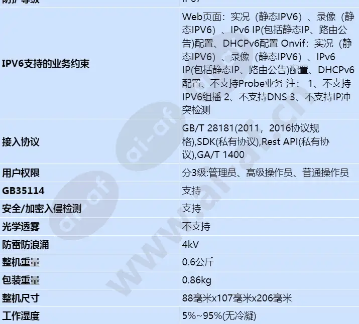 支持1 TOPS算力; 支持行为分析、人群态势分析、目标、人体; 采用1/2.7" CMOS; 120dB超级宽动态,强反差场景还原真实细节; 行为分析 快速移动检测,越线检测,入侵检测,区域进入/离开检测,徘徊检测 人群态势分析 排队长度统计,区域人数统计,人流量统计 目标 目标检测,目标属性检测 人体 人体检测 算力 1 TOPS Sensor感光面尺寸 1 / 2.7英寸CMOS 最低照度 彩色:0.005Lux(F1.6,AGC ON),黑白:0.0025Lux(F1.6,AGC ON),0Lux(红外开启) 镜头焦距 3.6毫米 镜头视角 水平79.2°;垂直:57.7° 红外灯补光距离 50m 视频编码格式 MJPEG/H.265 视频帧率 默认5MP分辨率20fps,4MP以下分辨率30/25fps可设置 以太网络接口 支持 以太网络接口数量 1个 以太网络接口带宽 1个RJ45 10M/100M自适应以太网口 电源类型 DC12V,PoE(IEEE 802.3af) 电源功耗 最大功耗:7.8W,典型功耗:3.3W 工作温度 -30°C~60°C 工作湿度 5%~95%(无冷凝) 防护等级 IP67 快门 支持慢快门; 慢快门等级:1/3,1/4,1/8,1/12,1/15; 非慢快门等级:1/25,1/30,1/50,1/60,1/90,1/100,1/120,1/125,1/180,1/250,1/350,,1/500,1/725,1/1000,1/1500,1/2000,1/3000,1/4000,1/6000,1/10000,1/30000,1/100000,自定义快门; 默认值 1/25; 日夜模式 支持;自动(ICR)/彩色/黑白 默认自动 灵敏度高、中、低 默认高 图像触发/内部触发 增益控制 手动曝光时,0~100共101档以步长1可设。默认