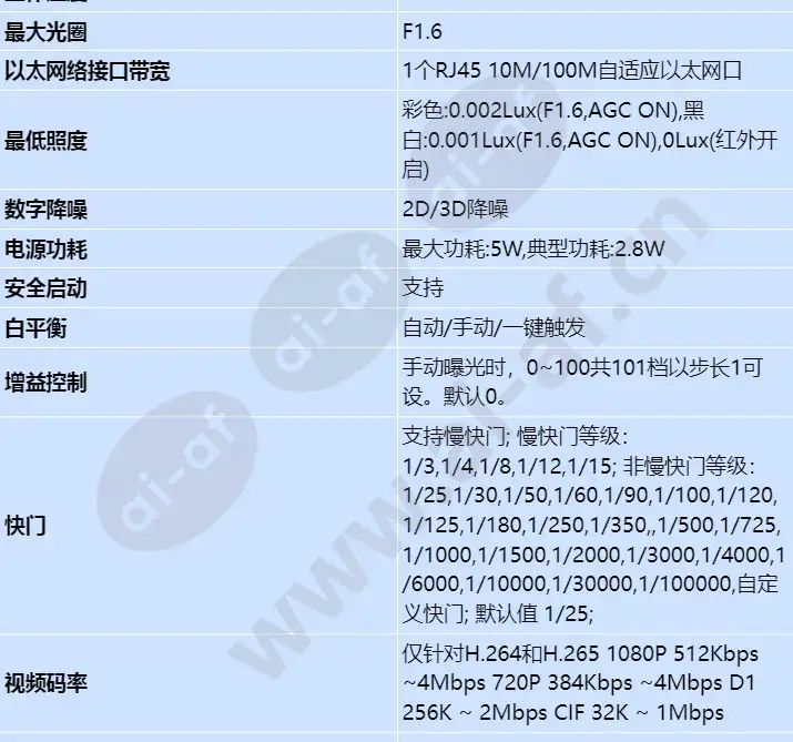 采用1/2.7" CMOS; 数字宽动态超级宽动态,强反差场景还原真实细节; 芯片 Hi3516EV200 内存 DDR2 0.0625 GB Flash SPI NAND FLASH Sensor最大图像尺寸 2MP 1920(横)* 1080(竖) Sensor感光面尺寸 1 / 2.7英寸CMOS 最低照度 彩色:0.002Lux(F1.6,AGC ON),黑白:0.001Lux(F1.6,AGC ON),0Lux(红外开启) 镜头焦距 2.8mm 镜头视角 水平:111.4°;垂直:58.9° 红外灯补光距离 30m 视频编码格式 MJPEG / H.264 / H.265 视频帧率 30/25fps可设置 音频编码格式 G.711a/G.711u/G.726 以太网络接口 支持 以太网络接口数量 1个 以太网络接口带宽 1个RJ45 10M/100M自适应以太网口 电源类型 DC12V,PoE(IEEE 802.3af) 电源功耗 最大功耗:5W,典型功耗:2.8W 工作温度 -30°C~60°C 工作湿度 5%~95%(无冷凝) 防护等级 IP67 快门 支持慢快门; 慢快门等级:1/3,1/4,1/8,1/12,1/15; 非慢快门等级:1/25,1/30,1/50,1/60,1/90,1/100,1/120,1/125,1/180,1/250,1/350,,1/500,1/725,1/1000,1/1500,1/2000,1/3000,1/4000,1/6000,1/10000,1/30000,1/100000,自定义快门; 默认值 1/25; 日夜模式 支持;自动(ICR)/彩色/黑白 默认自动 灵敏度高、中、低 默认高 图像触发/内部触发 增益控制 手动曝光时,0~100共101档以步长1可设。默认0。 白平衡 自动/手动/一键触发 数字降噪