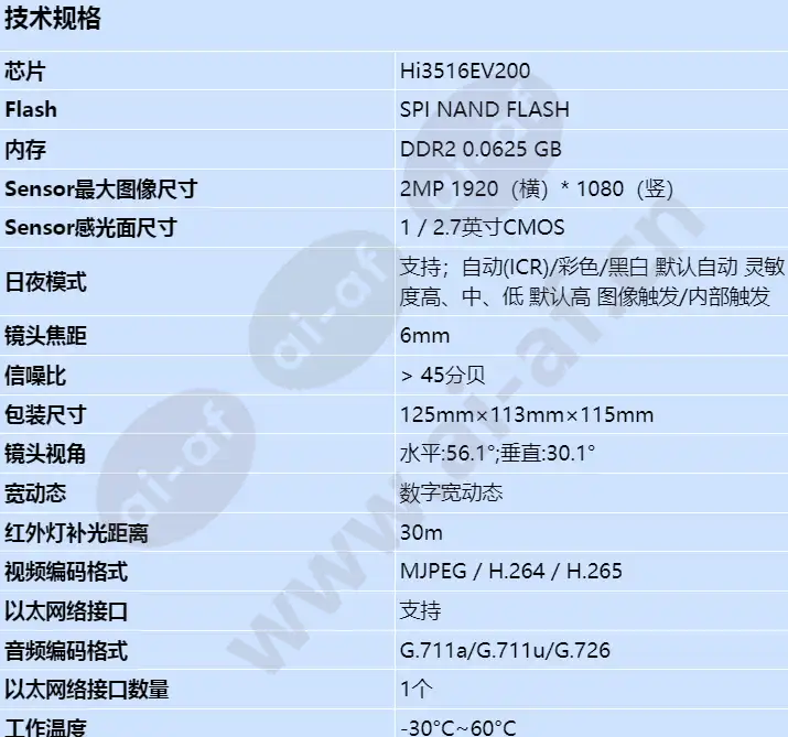 采用1/2.7" CMOS; 数字宽动态超级宽动态,强反差场景还原真实细节; 芯片 Hi3516EV200 内存 DDR2 0.0625 GB Flash SPI NAND FLASH Sensor最大图像尺寸 2MP 1920(横)* 1080(竖) Sensor感光面尺寸 1 / 2.7英寸CMOS 最低照度 彩色:0.002Lux(F1.6,AGC ON),黑白:0.001Lux(F1.6,AGC ON),0Lux(红外开启) 镜头焦距 6mm 镜头视角 水平:56.1°;垂直:30.1° 红外灯补光距离 30m 视频编码格式 MJPEG / H.264 / H.265 视频帧率 30/25fps可设置 音频编码格式 G.711a/G.711u/G.726 以太网络接口 支持 以太网络接口数量 1个 以太网络接口带宽 1个RJ45 10M/100M自适应以太网口 电源类型 DC12V,PoE(IEEE 802.3af) 电源功耗 最大功耗:5W,典型功耗:2.8W 工作温度 -30°C~60°C 工作湿度 5%~95%(无冷凝) 防护等级 IP67 快门 支持慢快门; 慢快门等级:1/3,1/4,1/8,1/12,1/15; 非慢快门等级:1/25,1/30,1/50,1/60,1/90,1/100,1/120,1/125,1/180,1/250,1/350,,1/500,1/725,1/1000,1/1500,1/2000,1/3000,1/4000,1/6000,1/10000,1/30000,1/100000,自定义快门; 默认值 1/25; 日夜模式 支持;自动(ICR)/彩色/黑白 默认自动 灵敏度高、中、低 默认高 图像触发/内部触发 增益控制 手动曝光时,0~100共101档以步长1可设。默认0。 白平衡 自动/手动/一键触发 数字降噪 2D/3D降噪