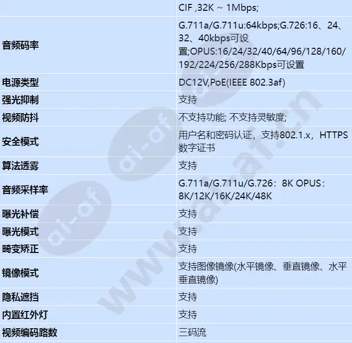 支持1 TOPS算力; 支持行为分析、人群态势分析、目标、人体; 采用1/2.7" CMOS; 120dB超级宽动态,强反差场景还原真实细节; 行为分析 快速移动检测,越线检测,入侵检测,区域进入/离开检测,徘徊检测 人群态势分析 排队长度统计,区域人数统计,人流量统计 目标 目标检测,目标属性检测 人体 人体检测 算力 1 TOPS Sensor感光面尺寸 1 / 2.7英寸CMOS 最低照度 彩色:0.005Lux(F1.6,AGC ON),黑白:0.0025Lux(F1.6,AGC ON),0Lux(红外开启) 镜头焦距 6mm 镜头视角 水平:49.2°;垂直:36° 红外灯补光距离 30m 视频编码格式 MJPEG/H.265 视频帧率 默认5MP分辨率20fps,4MP以下分辨率30/25fps可设置 音频编码格式 G.711a/G.711u/G.726/OPUS/AAC 以太网络接口 支持 以太网络接口数量 1个 以太网络接口带宽 1个RJ45 10M/100M自适应以太网口 电源类型 DC12V,PoE(IEEE 802.3af) 电源功耗 最大功耗:5.8W,典型功耗:3.3W 工作温度 -30°C~60°C 工作湿度 5%~95%(无冷凝) 防护等级 IP67 快门 支持慢快门; 慢快门等级:1/3,1/4,1/8,1/12,1/15; 非慢快门等级:1/25,1/30,1/50,1/60,1/90,1/100,1/120,1/125,1/180,1/250,1/350,,1/500,1/725,1/1000,1/1500,1/2000,1/3000,1/4000,1/6000,1/10000,1/30000,1/100000,自定义快门; 默认值 1/25; 日夜模式 支持;自动(ICR)/彩色/黑白 默认自动 灵敏度高、中、低 默认高 图像触发/内部