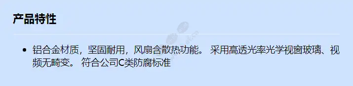 铝合金材质,坚固耐用,风扇含散热功能。 采用高透光率光学视窗玻璃、视频无畸变。 符合公司C类防腐标准 防腐等级 C类 净重 1.87kg 毛重 2.27kg 防护等级 IP66 产品尺寸 452*137*160mm 包装尺寸 185(w)*155(h)*485(l)mm 适用场景 配套枪机使用(不带灯) 工作电压 AC24V 抗振动标准 GB15211-2014 电功率 28W 视窗面积 67*57mm 自动温控 加热开:8°C±5°C 关:20°C±5°C(加热开时风扇同时运转) 风扇开:37°C±5°C关:20°C±5°C 材料 铸铝+铝合金型材
