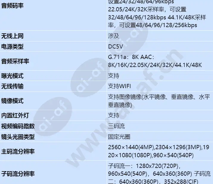 采用1/3" CMOS; 不涉及超级宽动态,强反差场景还原真实细节; 行为分析视频模式 人形检测 分辨率 4MP 2560(横)* 1440(竖) Sensor感光面尺寸 1/3" CMOS 镜头焦距 4mm 镜头视角 水平:78°;垂直:42°以上角度误差±5% 红外灯补光距离 10m WIFI 涉及 视频编码格式 H.264/H.265 视频帧率 15fps 音频编码格式 G.711a/G.711u/G.726/AAC(默认AAC) 云台旋转角度 水平0°~350°±3° 垂直-40°~50°±3° 云台水平速度 电机平均速度不小于32°/s 云台垂直速度 电机平均速度不小于32°/s 以太网络接口 支持 以太网络接口数量 2个 以太网络接口带宽 1个RJ45 10M/100M自适应以太网口 1个WIFI4 电源类型 DC5V 电源功耗 小于5W 工作温度 -10°C~45°C 工作湿度 5%~95%(无冷凝) 防护等级 IP30 最大光圈 F1.6 镜头光圈类型 固定光圈 内置红外灯 支持 防雷防浪涌 2kV 整机重量 174g 包装重量 298g 整机尺寸 73.6x75x115mm 包装尺寸 79*77*165mm SD接口支持最大容量 提供MicroSD卡插槽,支持MicroSDHC/MicroSDXC,支持最大容量256GB内存卡 音频输入接口 支持(1路内置MIC) 音频输出接口 支持(1路扬声器) 无线传输 支持WIFI 视频编码路数 三码流 主码流分辨率 2560×1440(4MP),2304×1296(3MP),1920×1080(1080P),960×540(540P) 子码流分辨率 子码流一:1280x720(720P),960x540(540P),640x360(360P) 子码流二:640x360(360P),352x288(CIF) 视频码率