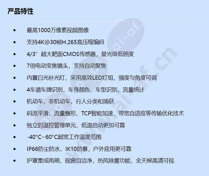 最高1000万像素视频图像 支持4K@30帧H.265高压缩编码 4/3”超大靶面CMOS传感器,星光级低照度 7倍电动变焦镜头,支持自动聚焦 内置白光补光灯,采用高效LED灯组,强度与角度可调 4车道车牌识别,车身颜色、车型识别,流量统计 机动车,非机动车,行人分类和捕获 码流平滑、流量整形、TCP智能加速、带宽自适应等传输优化技术 独立的温控管理单元,低温启动更加可靠 -40°C~60°C超宽工作温度范围 IP66防尘防水、IK10防暴,户外应用更可靠 护罩集成雨刷,视窗自洁净,热风除雾功能,全天候高清可视 产品型号 IPC6285-VWZ-LPR 图像传感器 4/3” 1000万像素逐行扫描 CMOS 有效图像尺寸 3840x2160(4K UHD),3648x2736(1000万) 最低照度 彩色:0.008lux黑白:0.008lux ,0lux(开启红外) 日夜模式 自动/彩色/黑白(ICR 红外截止滤光片式) 宽动态范围 120分贝 白平衡 自动/自动跟随/手动/一次性校准 强光抑制 支持 电子透雾 自动/手动 视频防抖 6轴电子防抖 数字降噪 支持智能自适应2D/3D降噪 焦距 12-84mm,水平视场角:74°~11°,支持AF自动聚焦 最大光圈 F1.5 自动光圈 虹膜 内置补光灯 3~4车道补光,最佳补光距离25米,发光强度与角度可调 视频压缩格式 H.265 / H.264 / MJPEG 最大分辨率 1000万(3648x2736, 4:3 模式),4K UHD(3840x2160, 16:9模式) 帧率 1000万最高25fps,4K UHD最高30fps 多码流 三码流,子码流支持1080p高清编码 前端接入协议 ONVIF Profile S/G,GB/T 28181-2014,HUAWEI SDK 网络协议