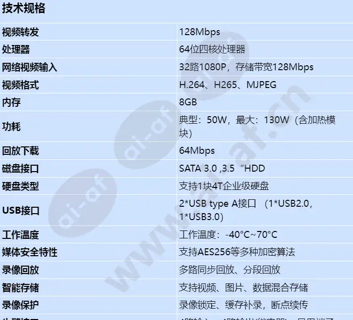 强智能 高存储 高精度 全开放 高精度 世界坐标系 车道级数据 50cm定位精度 高存储 4TB 存储,视、图、数混存 全开放 元数据全开放,标准接口 端边云协同,IEF算法加载 容器化轻量部署第三方软件 强智能 32T算力 目标识别率>95% 数据准确率>95% 网络视频输入 32路1080P,存储带宽128Mbps 视频转发 128Mbps 回放下载 64Mbps 录像方式 支持手动录像、计划录像、告警联动触发录像 录像回放 多路同步回放、分段回放 录像保护 录像锁定、缓存补录,断点续传 媒体传输 支持带宽自适应、FEC(向前纠错1.0)、SEC(向前纠错2.0)、组播特性 智能存储 支持视频、图片、数据混合存储 磁盘接口 SATA 3.0 ,3.5“HDD 硬盘类型 支持1块4T企业级硬盘 媒体安全特性 支持AES256等多种加密算法 水印特性 支持前端数字水印及被篡改后产生告警 视频格式 H.264、H265、MJPEG 设备接入 支持HUAWEI SDK、GB/T 28181、GA1400等标准 重量(不含硬盘) 7.5kg 工作温度 工作温度:-40°C~70°C 工作湿度 工作湿度:5%~90%(非冷凝) 功耗 典型:50W,最大:130W(含加热模块) 电源 典型:50W,最大:130W(含加热模块) 外形尺寸 80mm(高)x380mm(宽)x 300mm(深) 处理器 64位四核处理器 内存 8GB 查询方式 按时间、事件查询 下载方式 高速下载、批量下载、分段下载 网络接口 上行:1*GE SFP+1*GE RJ45 combo接口 下行:4*GE SFP+8*GE RJ45 USB接口 2*USB type A接口 (1*USB2.0,1*USB3.0) 音频输入 1路,3.5 Jack接口,line in 音频输出 1路,3.5 Jack接口
