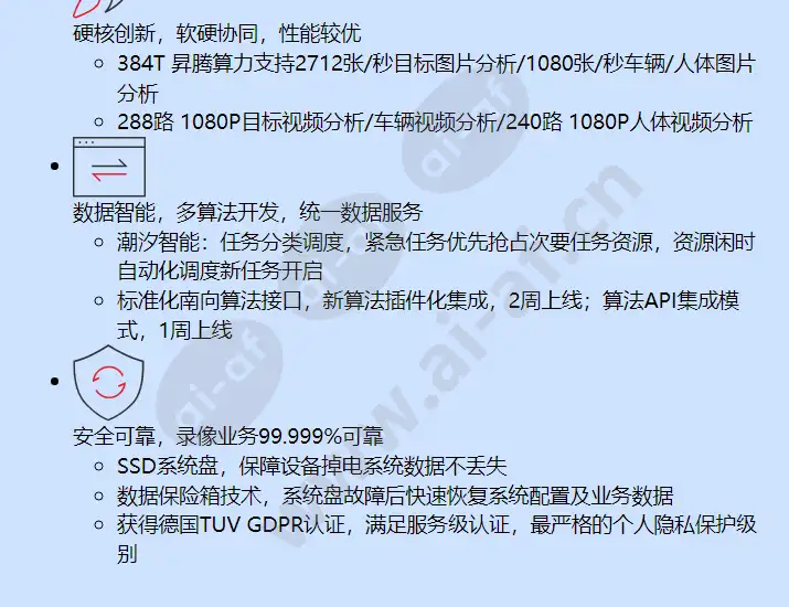 云边协同,支撑跨域协同作战 硬核创新,软硬协同,性能较优 数据智能,多算法开发,统一数据服务 安全可靠,录像业务99.999%可靠 云边协同,支撑跨域协同作战 省市区县3级协同,资源跨域共享、统一分布式设防、算法在线升级,数据按需订阅,大大提升全网协同应用效能 vPaaS平台将传统业务容器化,不同算法的智能分析、集群调度服务按需部署,灵活组合,适应多样化业务场景 视图融合分析,目标识别、人体、车辆、行为分析分析算法服务融合部署 相比传统视频监控架构,省去不同算法的GPU分析服务器,大大降低客户TCO成本 硬核创新,软硬协同,性能较优 384T 昇腾算力支持2712张/秒目标图片分析/1080张/秒车辆/人体图片分析 288路 1080P目标视频分析/车辆视频分析/240路 1080P人体视频分析 数据智能,多算法开发,统一数据服务 潮汐智能:任务分类调度,紧急任务优先抢占次要任务资源,资源闲时自动化调度新任务开启 标准化南向算法接口,新算法插件化集成,2周上线;算法API集成模式,1周上线 安全可靠,录像业务99.999%可靠 SSD系统盘,保障设备掉电系统数据不丢失 数据保险箱技术,系统盘故障后快速恢复系统配置及业务数据 获得德国TUV GDPR认证,满足服务级认证,最严格的个人隐私保护级别 网络接口 8*GE,4*10GE 产品形态 2U双路机架 处理器 两颗64核鲲鹏920处理器,2.6GHZ主频 内存 384GB DDR4,最大支持32个DIMM,最高主频2933MHz 系统盘 2 x 960G SSD,RAID1(高可靠性) 结构化数据存储 8 x 3.84T SSD AI加速单元 最多384TOPS @int8 ,24颗昇腾AI芯片 管理特性 集成iBMC 网络协议