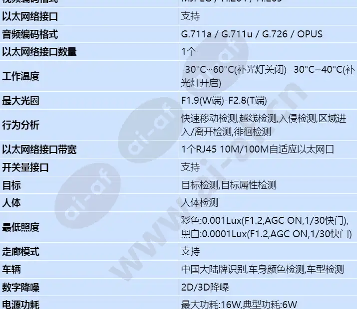 支持1 TOPS算力; 支持多算法切换、行为分析、人群态势分析、目标、人体、机非人、车辆、车辆事件检测、交通数据统计; 支持背光自适应、透雾自适应、速度自适应; 采用1/1.8" CMOS; 软件定义,支持算法在线加载与升级; 120dB超级宽动态,强反差场景还原真实细节; 支持多算法切换; 芯片 Hi3516DV300 算力 1 TOPS 内存 DDR3 0.5 GB Flash SPI NAND FLASH Sensor最大图像尺寸 2MP 1920(横)* 1080(竖) Sensor感光面尺寸 1 / 1.8英寸CMOS 最低照度 彩色:0.001Lux(F1.2,AGC ON,1/30快门),黑白:0.0001Lux(F1.2,AGC ON,1/30快门) 镜头焦距 2.8-12mm 镜头视角 水平:42°(T端)~95.5°(W端);垂直:24°(T端)~52°(W端) 白光灯补光距离 30m 视频编码格式 MJPEG / H.264 / H.265 视频帧率 60/50/30/25fps可设置,默认值25fps 音频编码格式 G.711a / G.711u / G.726 / OPUS 车辆 中国大陆牌识别,车身颜色检测,车型检测 车辆事件检测 机占非检测,非占机检测,违法停车检测,逆行/倒车检测 交通数据统计 车流量统计,非机动车流量统计,行人统计 行为分析 快速移动检测,越线检测,入侵检测,区域进入/离开检测,徘徊检测 人群态势分析 排队长度统计,区域人数统计,人流量统计 目标 目标检测,目标属性检测 人体 人体检测 非机动车流量统计 机非人检测,行人检测,机动车检测 RS485接口 支持 开关量接口 支持 以太网络接口 支持 以太网络接口数量 1个 以太网络接口带宽 1个RJ45 10M/100M自适应以太网口 电源类型 DC12V,PoE(IEEE