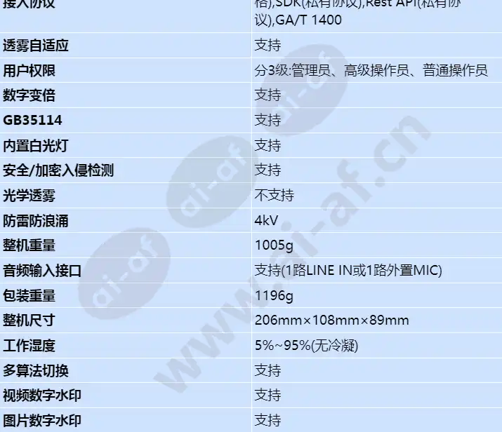 支持1 TOPS算力; 支持多算法切换、行为分析、人群态势分析、目标、人体、机非人、车辆、车辆事件检测、交通数据统计; 支持背光自适应、透雾自适应; 采用1/1.8" CMOS; 软件定义,支持算法在线加载与升级; 120db超级宽动态,强反差场景还原真实细节; 车辆 中国大陆牌识别,车身颜色检测,车型检测,车款检测 车辆事件检测 机占非检测,非占机检测,违法停车检测,逆行/倒车检测 交通数据统计 车流量统计,非机动车流量统计,行人统计 行为分析 快速移动检测,越线检测,入侵检测,区域进入/离开检测,徘徊检测 人群态势分析 排队长度统计,区域人数统计,人流量统计 目标 目标检测,目标属性检测,目标识别 人体 人体检测 机非人 机非人检测,骑行人属性检测 芯片 Hi3516DV300 算力 1 TOPS Sensor感光面尺寸 1 / 1.8英寸CMOS 最低照度 彩色:0.005Lux(F1.2,AGC ON,1/30快门),黑白:0.0025Lux(F1.2,AGC ON,1/30快门) 镜头焦距 2.8-12mm 镜头视角 W:104°(水平)*54.0°(垂直) T:40°(水平)*21.3°(垂直) 白光灯补光距离 15m 视频编码格式 MJPEG / H.264 / H.265 视频帧率 60/50/30/25fps可设置 音频编码格式 G.711a/G.711u/G.726/OPUS/AAC RS485接口 支持 开关量接口 支持 以太网络接口 支持 以太网络接口数量 1个 以太网络接口带宽 1个RJ45 10M/100M自适应以太网口 电源类型 DC12V,PoE(IEEE 802.3at) 电源功耗 最大功耗:11.4W,典型功耗:3.6W 工作温度 -30°C~55°C(不开灯) -30°C~40°C(开灯) 工作湿度 5%~95%(无冷凝) 防护等级