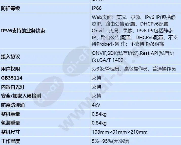 支持1 TOPS算力; 支持热度图、行为分析、人脸、人体; 采用1/2.7" CMOS; 120dB超级宽动态,强反差场景还原真实细节; 芯片 Hi3516DV300 算力 1 TOPS 内存 DDR3 1.0 GB Flash SPI NAND闪存256.0 MB Sensor最大图像尺寸 4MP 2560(横)* 1440(竖) Sensor感光面尺寸 1/2.7" 最低照度 彩色:0.015Lux(F1.2,AGC ON,1/30快门),黑白:0.0075Lux(F1.2,AGC ON,1/30快门) 镜头焦距 6mm 镜头视角 水平:49.3°;垂直:35.9° 白光灯补光距离 10m 视频编码格式 MJPEG / H.264 / H.265 热度图 支持 行为分析 快速移动检测 人脸 人脸检测,人脸属性检测 人体 人体检测 以太网络接口 支持 以太网络接口数量 1个 以太网络接口带宽 1个RJ45 10M/100M以太网口 电源类型 DC12V 电源功耗 最大功耗:7W,典型功耗:1.8W 工作温度 -30°C~60°C(补光灯关闭) -30°C~40°C(补光灯开启) 工作湿度 5%~95%(无冷凝) 防护等级 IP66 Sensor最大图像尺寸 4MP 2560(横)* 1440(竖) Sensor感光面尺寸 1/2.7" 最低照度 彩色:0.015Lux(F1.2,AGC ON,1/30快门),黑白:0.0075Lux(F1.2,AGC ON,1/30快门) 快门 1/3秒~1/68250秒 日夜模式 自动(ICR)/彩色/黑白 增益控制 手动曝光时,0~100共101档以步长1可设。默认0。 白平衡 自动/手动/一键触发 数字降噪 2D/3D降噪 宽动态 120分贝 强光抑制 支持 视频防抖 支持 算法透雾 支持 曝光补偿 支持 曝光模式 支持 信噪比