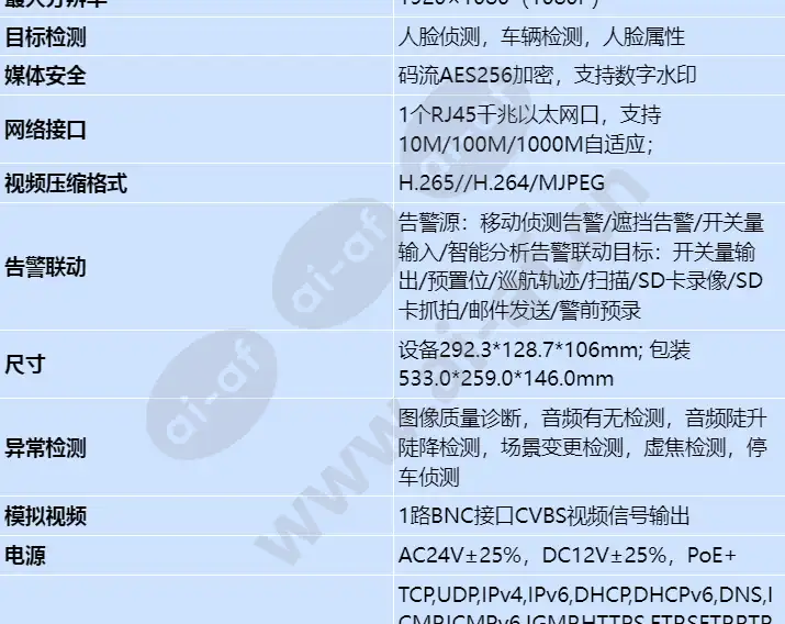 采用1/1.8"逐行扫描CMOS 支持Extra265/H.265/H.264高清低码流编码 支持双路独立1080P高清编码 120dB超级宽动态,反差场景真实还原细节信息 智能透雾,增强雾天场景下图像清晰度 100米红外照射距离,采用高效红外灯组,寿命更长 SEC超强纠错,20%网络丢包图像依然流畅 高隐BI性的红外技术,夜幕下监控于无形 超宽工作电压范围、超宽工作温度范围 支持PoE+,支持AC/DC供电方式 产品型号 M2220-In 图像传感器 1/1.8" 200万像素逐行扫描CMOS 有效图像尺寸 1920*1080 最低照度 彩色:0.0002Lux (F1.5,AGC ON)黑白:0.0001Lux (F1.5,AGC ON) 日夜模式 自动/彩色/黑白(ICR 红外截止滤光片式) 宽动态范围 120分贝 白平衡 自动/自动跟踪/手动 强光抑制 支持 图像透雾 自动/手动/关闭 视频防抖 自动/手动 数字降噪 支持智能自适应2D/3D降噪 焦距 8-32mm 最大光圈 F1.6(W端)-F1.65(T端) 光圈类型 虹膜 红外补光距离 100米 隐形红外 支持,红外开启肉眼不可见 视频压缩格式 H.265//H.264/MJPEG 最大分辨率 1920×1080(1080P) 帧率 60Hz:60/30/20~1fps;50Hz:50/25/20~1fps 多码流 五码流,支持1080p双路独立高清编码 智能编码 Extra265 前端接入协议 ONVIF Profile S/G/T、GB/T 28181 -2016、HUAWEI SDK 网络协议 TCP,UDP,IPv4,IPv6,DHCP,DHCPv6,DNS,ICMP,ICMPv6,IGMP,HTTPS,FTP,SFTP,RTP,RTSP,RTCP,SIP,ARP,SSL,NTP,SNMP