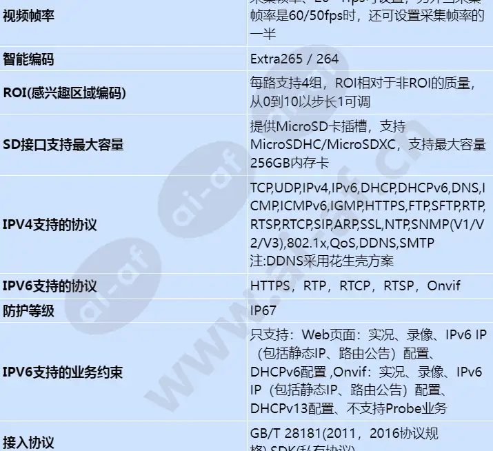 支持目标; 采用1/1.8" CMOS; 120dB超级宽动态,强反差场景还原真实细节; 芯片 Hi3519V101 内存 DDR3 1.0 GB Flash SPI NAND闪存256.0 MB Sensor最大图像尺寸 2MP 1920(横)* 1080(竖) Sensor感光面尺寸 1 / 1.8英寸CMOS 最低照度 彩色:0.0004Lux @(F1.6, AGC ON),黑白:0.0001 Lux @(F1.6, AGC ON) 镜头焦距 8-32mm 镜头视角 水平:13.44°(T端)~42.3°(W端);垂直:7.7°(T端)~23.34°(W端) 白光灯补光距离 15m 视频编码格式 MJPEG / H.264 / H.265 音频编码格式 G.711a / G.711u / G.726 / OPUS 目标 目标属性检测 RS485接口 支持 开关量接口 支持 以太网络接口 支持 以太网络接口数量 1个 以太网络接口带宽 1个RJ45 10M/100M/1000M自适应以太网口 电源类型 AC24V,DC12V,POE(IEEE 802.3at) 电源功耗 最大功耗:17.4W,典型功耗:4W 工作温度 -40°C~60°C(补光灯关闭) -40°C~40°C(补光灯打开) 工作湿度 5%~95%(无冷凝) 防护等级 IP67 防暴 IK10(报告支持) 快门 支持慢快门; 慢快门等级:1/3,1/4,1/8,1/12,1/15; 非慢快门等级:1/25,1/30,1/50,1/60,1/90,1/100,1/120,1/125,1/180,1/250,1/350,,1/500,1/725,1/1000,1/1500,1/2000,1/3000,1/4000,1/6000,1/10000,1/30000,1/100000,自定义快门; 默认值