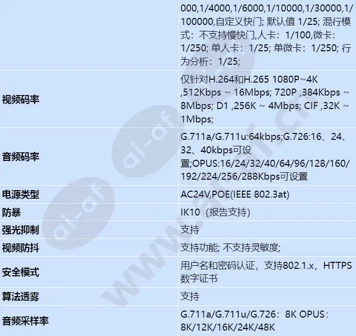 支持2 TOPS算力; 支持全结构化、1拖N功能、多算法切换、行为分析、人群态势分析、目标、人体、机非人、车辆、车辆事件检测、交通数据统计; 支持背光自适应、透雾自适应; 采用1/1.8" CMOS; 软件定义,支持算法在线加载与升级; 120dB超级宽动态,强反差场景还原真实细节; 支持全结构化; 车辆 中国大陆牌识别,中国香港车牌识别,车牌增强,车身颜色检测,车型检测,车款检测 车辆事件检测 机占非检测,非占机检测,违法停车检测,逆行/倒车检测 交通数据统计 车流量统计,非机动车流量统计,行人统计 行为分析 快速移动检测,越线检测,入侵检测,区域进入/离开检测,徘徊检测 人群态势分析 排队长度统计,区域人数统计,人流量统计 目标 目标检测,目标抓拍增强,目标属性检测 人体 人体检测,人体属性检测 机非人 机非人检测,行人检测,机动车检测,骑行人属性检测 芯片 Hi3519AV100 算力 2 TOPS Sensor感光面尺寸 1 / 1.8英寸CMOS 最低照度 彩色:0.001Lux(F1.2,AGC ON,1/30快门),黑白:0.0001Lux(F1.2,AGC ON,1/30快门) 镜头焦距 12-55mm 镜头视角 水平:9.2°(T端)~40.3°(W端);垂直:5.3°(T端)~22.8°(W端) 白光灯补光距离 30m 视频编码格式 MJPEG / H.264 / H.265 视频帧率 30/25fps可设置,默认值25fps 音频编码格式 G.711a / G.711u / G.726 / OPUS 1拖N功能 支持 RS485接口 支持 开关量接口 支持 以太网络接口 支持 以太网络接口数量 1个 以太网络接口带宽 1个RJ45 10M/100M自适应以太网口 电源类型 AC24V,POE(IEEE 802.3at) 电源功耗 最大功耗:21.7W