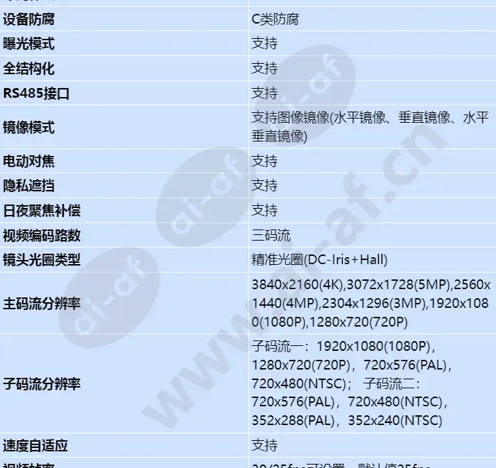 支持2 TOPS算力; 支持全结构化、行为分析、人群态势分析、目标、人体、机非人、车辆、车辆事件检测、交通数据统计; 支持背光自适应、透雾自适应、速度自适应; 采用1/1.8" CMOS; 软件定义,支持算法在线加载与升级; 120db超级宽动态,强反差场景还原真实细节; 9:16 镜像设计,车位数识别更多; 大倾角车牌识别算法,更精准; 车辆 中国大陆牌识别,车牌增强,车身颜色检测,车型检测,车款检测 车辆事件检测 机占非检测,非占机检测,违法停车检测,逆行/倒车检测 交通数据统计 车流量统计,非机动车流量统计,行人统计 行为分析视频模式 快速移动检测,越线检测,入侵检测,区域进入/离开检测,徘徊检测 人群态势分析 排队长度统计,区域人数统计,人流量统计 人体 人体检测,人体属性检测 机非人 机非人检测,骑行人属性检测 算力 2 TOPS 分辨率 8MP 3840(H)*2160(V) Sensor感光面尺寸 1 / 1.8英寸CMOS 最低照度 彩色:0.005Lux(F1.2,AGC ON,1/30快门),黑白:0.0005Lux(F1.2,AGC ON,1/30快门) 镜头焦距 12-55mm 镜头视角 水平:5.3°(T端)~22.8°(W端);垂直:9.2°(T端)~40.3°(W端) 白光灯补光距离 30m 视频编码格式 MJPEG / H.264 / H.265 视频帧率 30/25fps可设置,默认值25fps 音频编码格式 G.711a/G.711u/G.726/OPUS/AAC RS485接口 支持 开关量接口 支持 以太网络接口 支持 以太网络接口数量 1个 以太网络接口带宽 1个RJ45 10M/100M以太网口 电源类型 AC24V,POE(IEEE 802.3at) 电源功耗 最大功耗:25W,典型功耗:5W 工作温度 -40°C~60°C(补