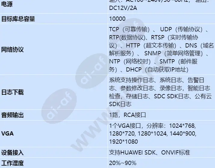 性能高、应用灵活 易部署维护 安全可靠 性能高、应用灵活 4路网络视频接入,80Mbps视频输入带宽 支持1个HDMI和1个VGA同时输出,支持4K高清分辨率输出 支持按时间、录像类型、标签、AI事件查询录像文件 易部署维护 自动发现配置功能 支持华为云协议接入平台及手机APP 人性化UI操作界面 安全可靠 支持重要录像文件加锁保护功能 视频转发 转发能力64Mbps 网络视频输入 4路,接入能力80Mbps 行为分析 支持华为SDC智能事件联动:移动侦测、区域入侵、绊线检测、音频异常、视频遮挡、进入/离开区域、快速移动、徘徊检测、过线计数、排队长度、区域人数统计、口罩识别检测 录像回放 多路同步回放:支持8路 多倍速回放:支持x1/16、1x/8、x1/4、x1/2速度慢进回放操作,支持x2、x4、x8、x16速度快进回放操作, 帧进播放 录像方式 支持手动录像、计划录像、移动侦测、IO告警联动触发的录像 磁盘数量 1盘位 预览模式 1/4/6/8画面 解码性能 8MP(4K):1路@30帧/秒 5MP:2路@20帧/秒 4MP:2路@30帧/秒 2MP(1080P):4路30帧/秒 与华为SDC配套开启目标识别AI功能,解码性能为原来一半 回放下载 回放能力64Mbps VGA 1个VGA接口,分辨率:1024*768, 1280*720, 1280*1024, 1440*900, 1920*1080 HDMI 1个HDMI1.4,分辨率:1024*768, 1280*720, 1280*1024, 1440*900, 1920*1080 , 2560*1440, 3840*2160 处理器 32位多核高性能处理器 内存 4Gbit( DDR3) 硬盘类型 每个接口最大容量支持8TB 磁盘接口 SATA3.0 查询方式 按时间、录像类型、AI事件查询 下载方式 批量下载