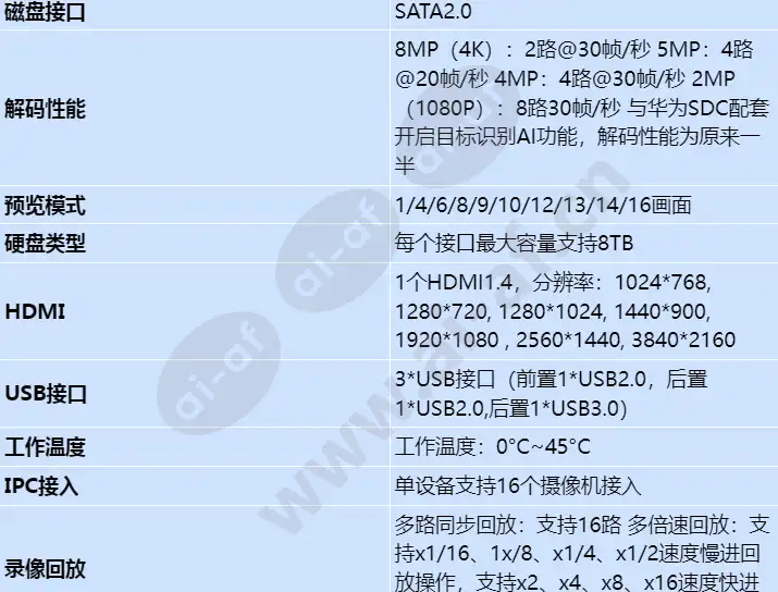性能高、应用灵活 易用易维 安全可靠 性能高、应用灵活 16路网络视频接入,168Mbps视频输入带宽 支持1个HDMI和1个VGA同时输出,支持4K高清分辨率输出 支持2个SATA接口 可配套华为SDC支持全通道AI智能:目标白名单通行、黑名单设防、陌生人识别、目标查询、智能周界、回头客分析、辅助考勤、车辆违停检测等多种智能侦测接入与联动 支持最大16路同步回放及倒放 支持4K高清网络视频的预览、存储与回放 支持USB外部数据回放 支持按时间、录像类型、标签、AI事件查询录像文件 安全可靠 支持重要录像文件加锁保护功能 采用嵌入式Linux 操作系统,支持7x24 小时稳定运行,且不易受到黑客、病毒的入侵和攻击 易用易维 内置8个IPC直连PoE网络接口,支持即插即用,自动发现配置功能 支持H.265、H.264编码前端自适应接入 支持华为云协议接入平台及手机APP 支持设备扫码二维码快速注册接入 人性化UI操作界面 支持IPC集中管理,包括IPC参数配置、信息的导入/导出、语音对讲和批量升级等功能 支持操作日志、系统日志、告警日志、参数修改日志、录像日志,智能日志检查,存储日志等功能 网络视频输入 16路,接入能力168Mbps 视频转发 转发能力128Mbps 回放下载 回放能力128Mbps 解码性能 8MP(4K):2路@30帧/秒 5MP:4路@20帧/秒 4MP:4路@30帧/秒 2MP(1080P):8路30帧/秒 与华为SDC配套开启目标识别AI功能,解码性能为原来一半 预览模式 1/4/6/8/9/10/12/13/14/16画面 磁盘数量 2盘位 录像方式 支持手动录像、计划录像、报警联动触发的录像 录像回放 多路同步回放:支持16路 多倍速回放:支持x1/16、1x/8、x1/4、x1/2速度慢进回放操作,支持x2、x4、x8、x16速度快进回放操作